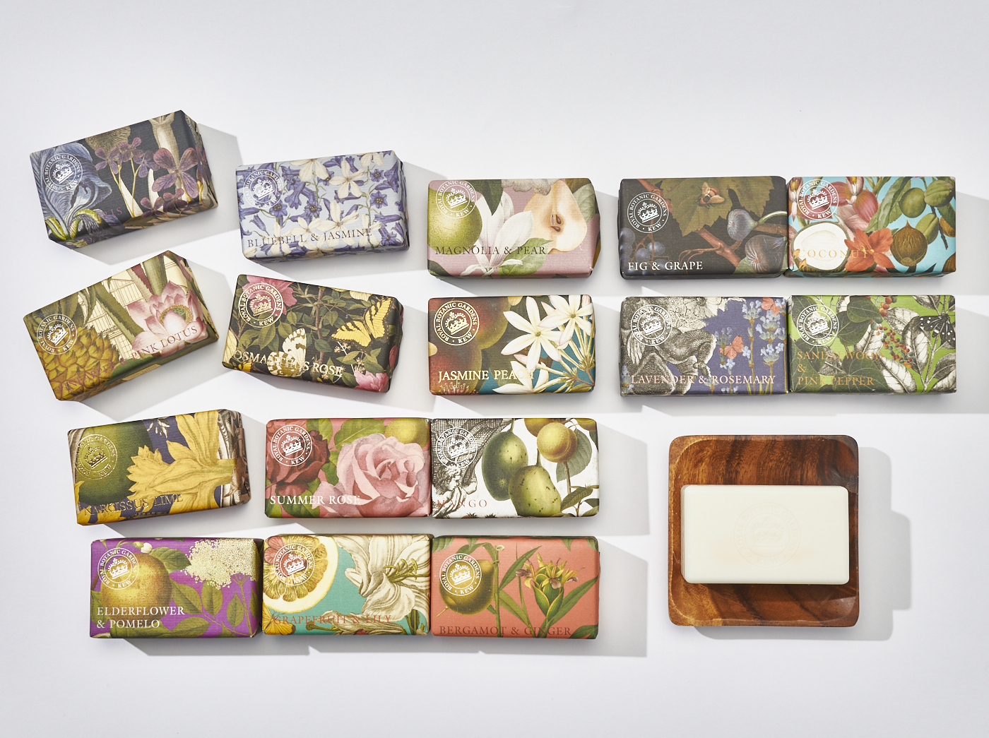 パッケージはキュー・ガーデンに昔から貯蔵してある植物学者たちが手書きした歴史的にも価値のある植物の絵を、ソープの香りに合わせて包み紙にした商品です。イギリス特有の香りのブレンドと滑らかな使用感が癒しを与えます。
