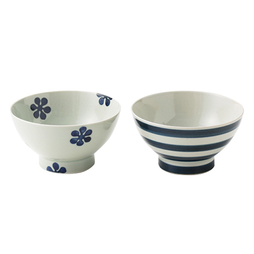 江戸時代から続く、波佐見焼。良質の日用の器を作り続けています。くらわんか丼ペア(藍花&ボーダー)はオシャレで可愛いデザインながらも、たっぷり入る容量のどんぶりで、満足感を味わえます。高台が高めに作られているので熱いものを召し上がる時にも便利です。