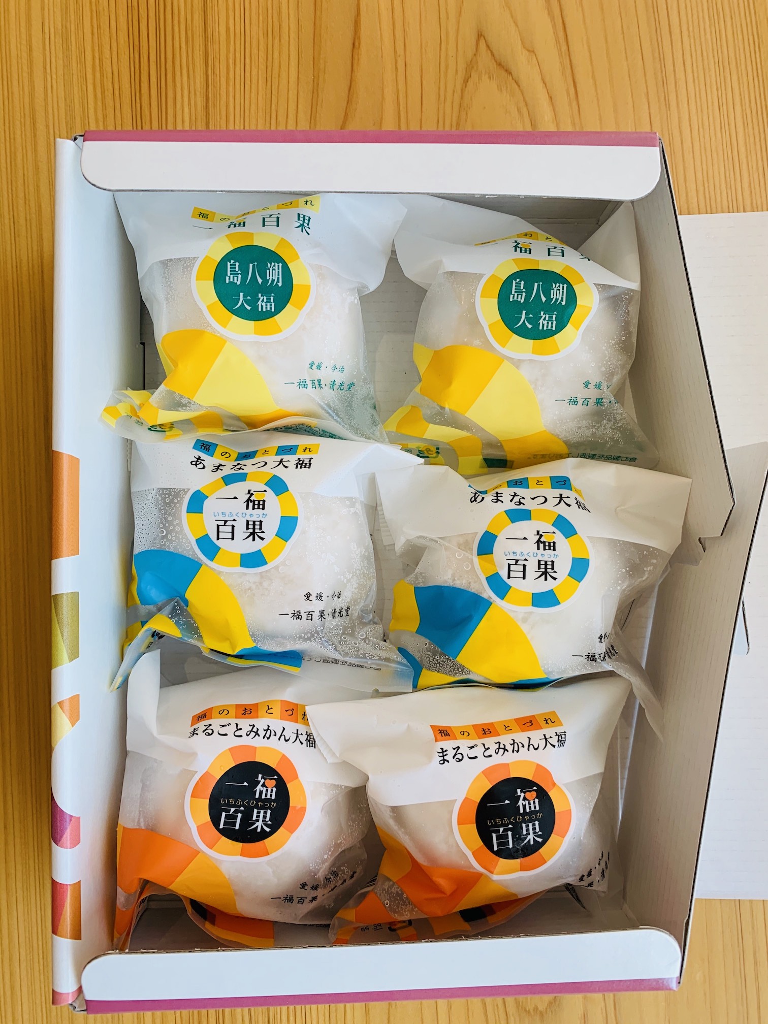 | 原材料 | みかん大福:みかん、白手亡、砂糖、餅米粉、ばれいしょでんぷん/トレハロース、増粘多糖類 島八朔大福:八朔シロップ漬け(八朔、砂糖)、白手亡、砂糖、餅米粉、ばれいしょでんぷん/トレハロース、増粘多糖類、酸味料 甘夏大福:甘夏シロップ漬け(甘夏、砂糖)、白手亡、砂糖、馬鈴薯でんぷん/トレハロース、増粘多糖類、酸味料 |