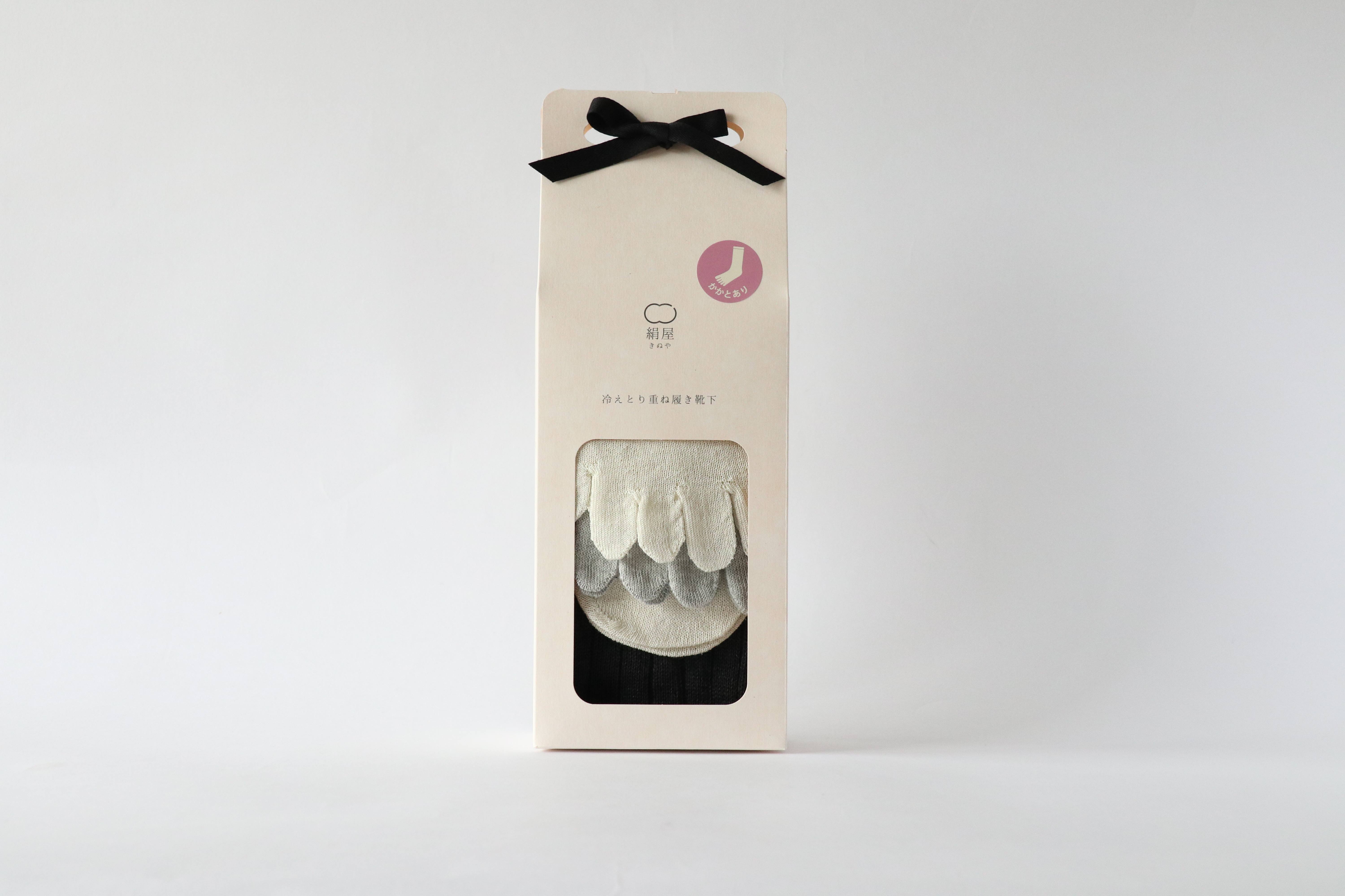 シルクを中心とした雑貨ブランド「絹屋」の「シルクと綿重ね履き4足セット」です。シルクと絹の5本指ソックスと、綿の靴下の計4足がセットになっています。吸湿性や放湿性が優れてるので、夏は涼しく冬は暖かいので1年中お使いいただけます。再生紙を利用した紙箱もポイントです。
