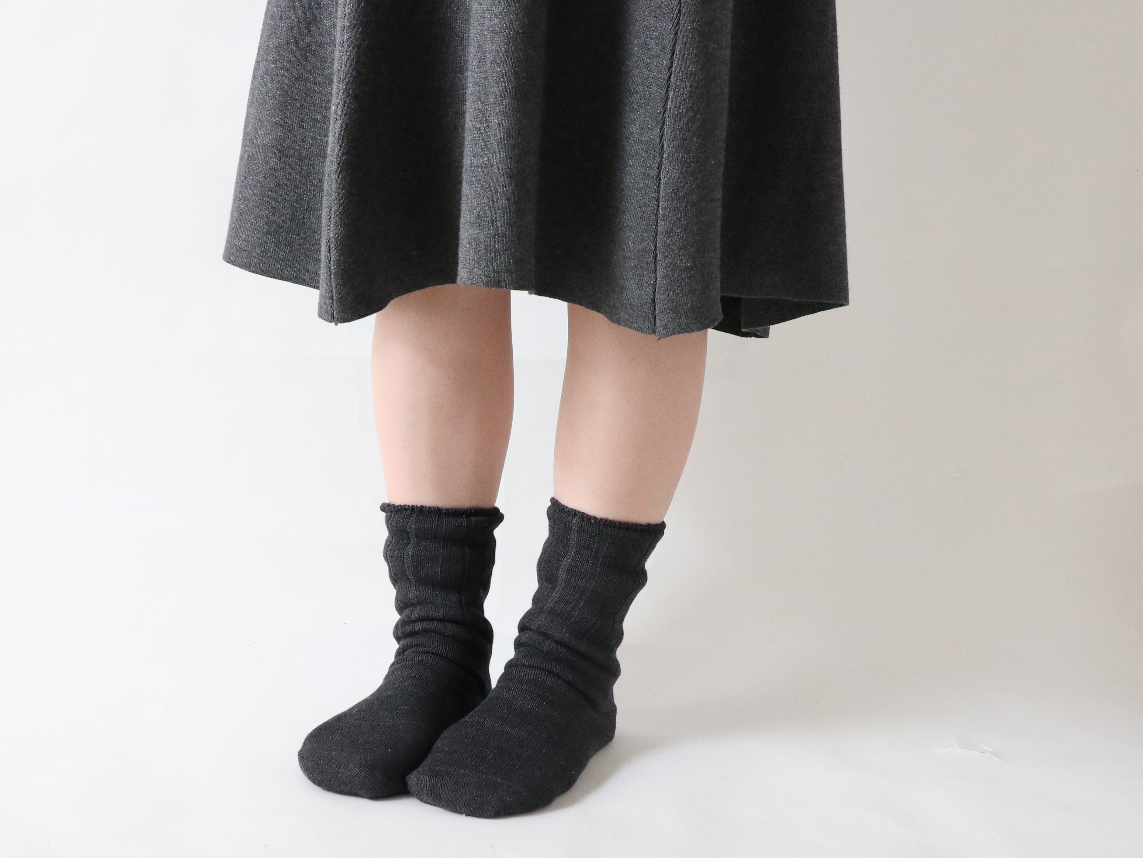 絹先丸靴下は、1枚目と2枚目から出された湿気を外に出し、むくんでも履き口に跡が付きにくい優しい履き心地です。 血流を妨げないように編んで締め付けがないので、就寝中にもお使いいただけます。 絹と天然素材を交互に履くことで、半身浴の状態を作っていきます。