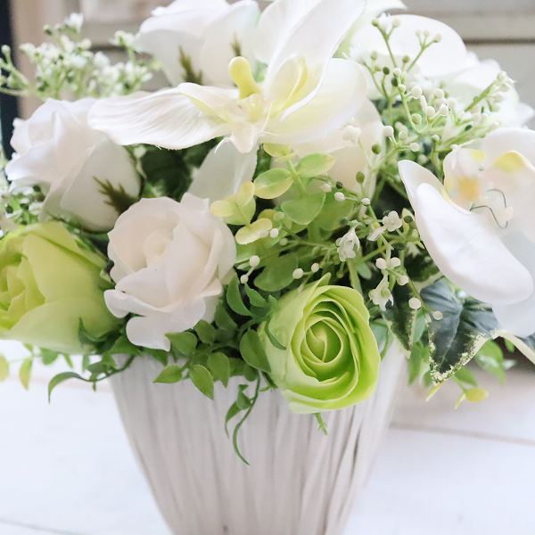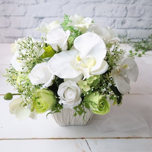 上質なアーティフィシャルフラワーと、ほのかに香るソープフラワーでアレンジされています。花器付きなので、届いたらすぐにそのまま置いて飾って頂けます。水替えやお花の取り換えなども不要です。