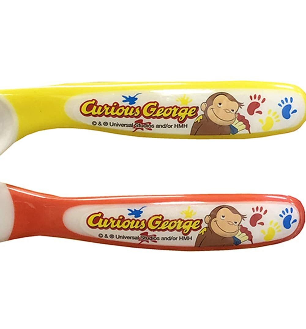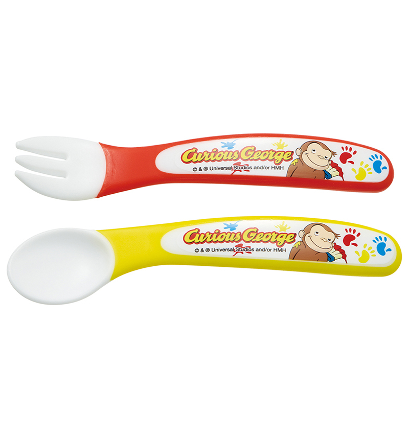 上手に食べることを覚えるための、スプーン&フォークセット。子供が大好きなおさるのジョージデザイン、怪我をしないよう安全形状されているので初めてのスプーン、フォークにぴったりです。お子様用にはもちろん、出産祝いの贈り物にぜひ、いかがでしょうか。