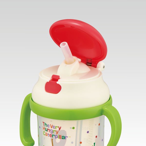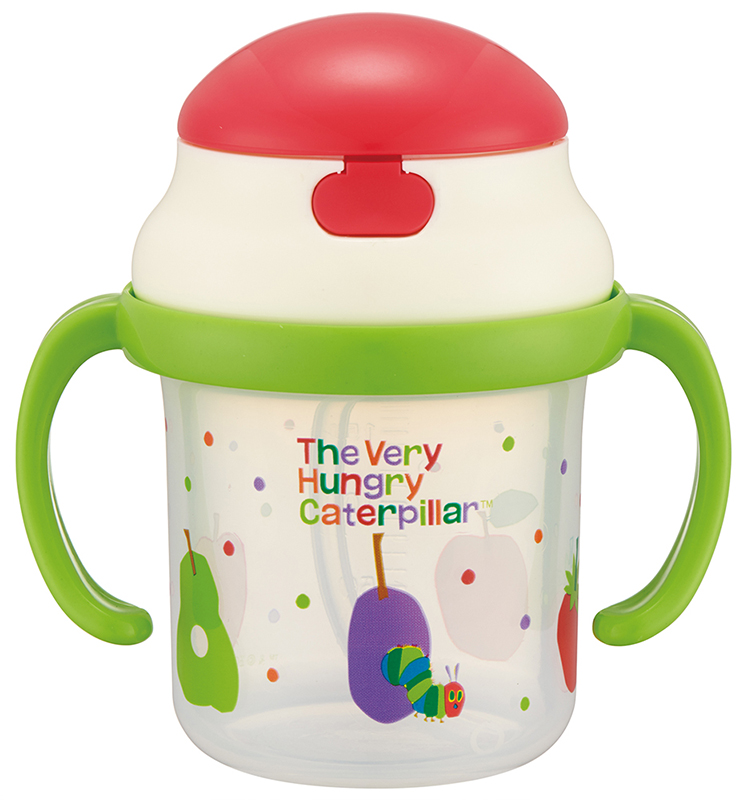 エリックカールの絵本「はらぺこあおむし」がデザインされた、ストローホッパー両手マグをお届け。生後8ヵ月頃からのお子さまにぴったりなストローマグです。フタのオープンが簡単なプッシュボタン式、持ち手は取り外しが可能。電子レンジ・薬液消毒対応しています。