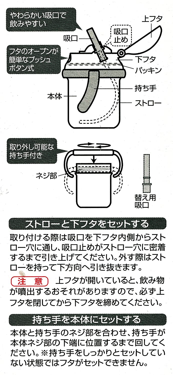 大口注文・法人のお問い合わせはこちら生後8ヵ月頃からのお子さまにぴったりなストローマグです。お子様が自分で持ちやすいよう、持ち手付き。本体のみ電子レンジ対応、薬液消毒可能です。 ※熱湯消毒・食器洗浄乾燥機は対応不可。
