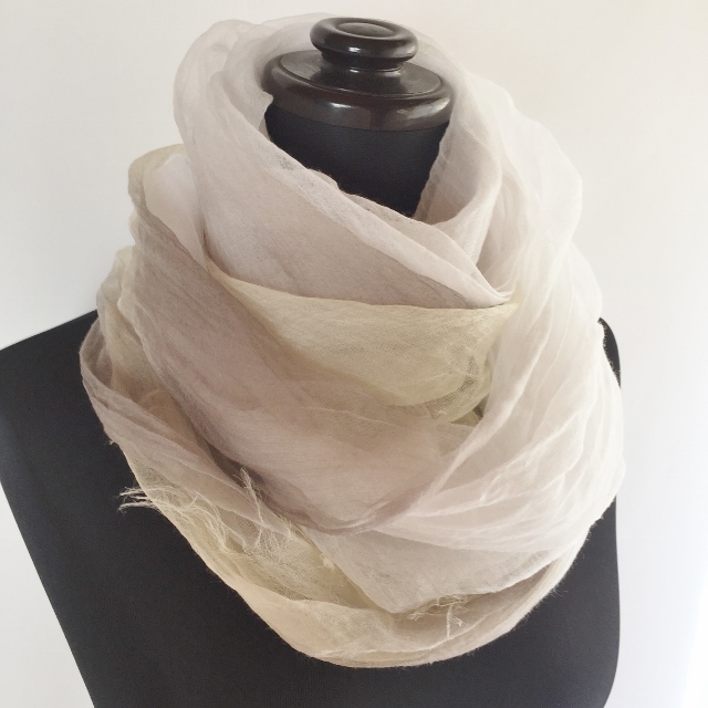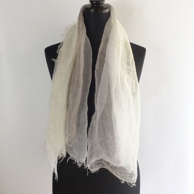 その重さはわずか37g! 巻いているのを感じません。 超極細の糸で織ってあるので、肌触りはとてもしなやかで、 よく麻にありがちなチクチクした不愉快さは全くありません。