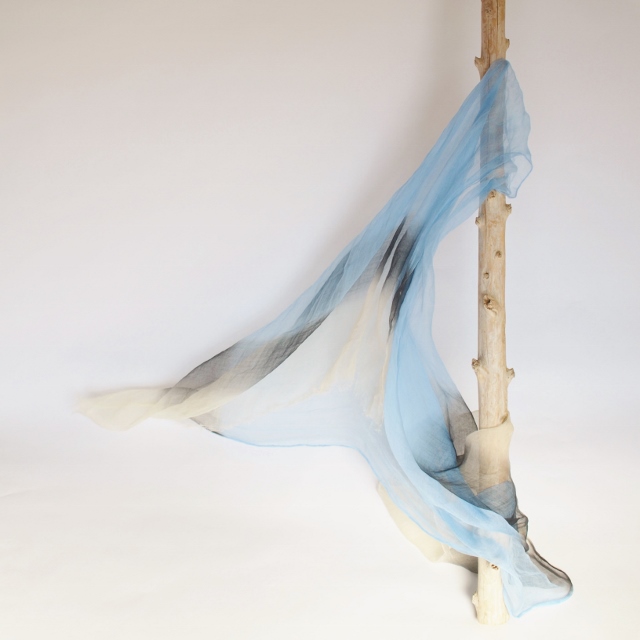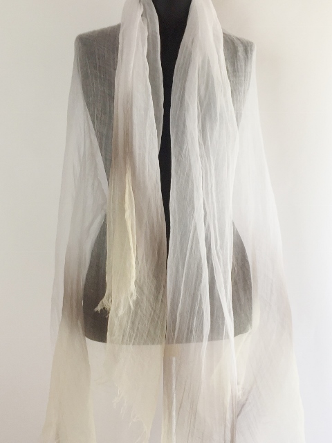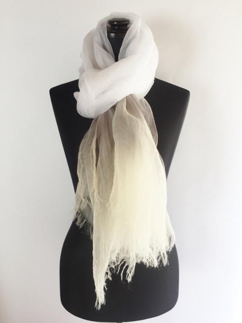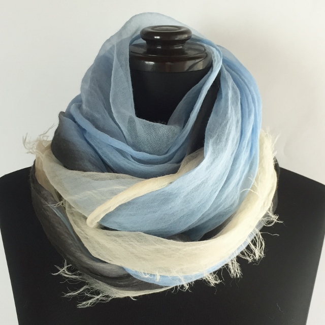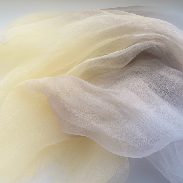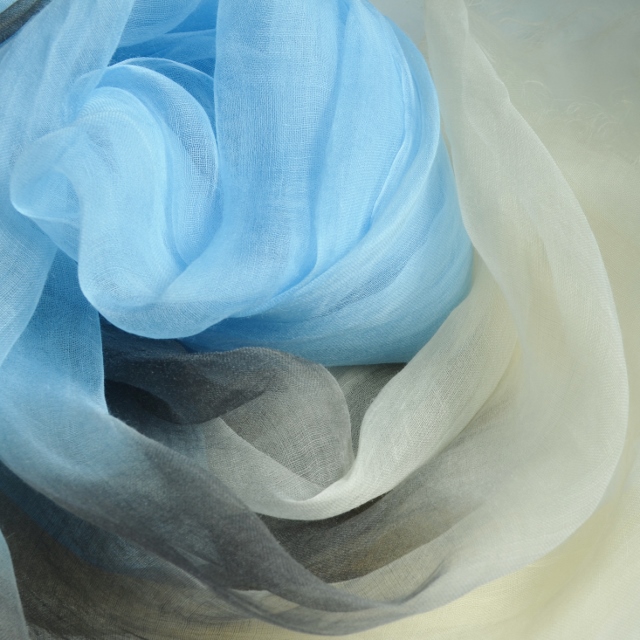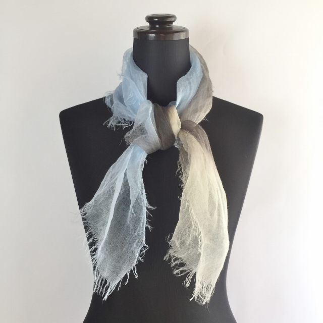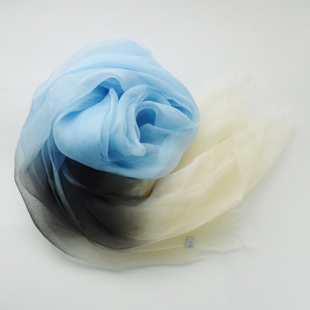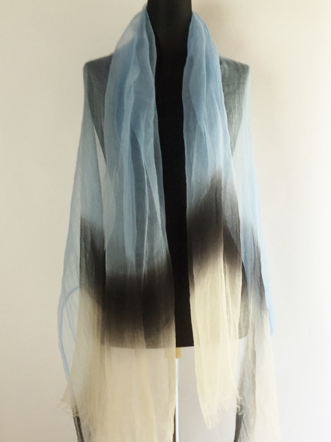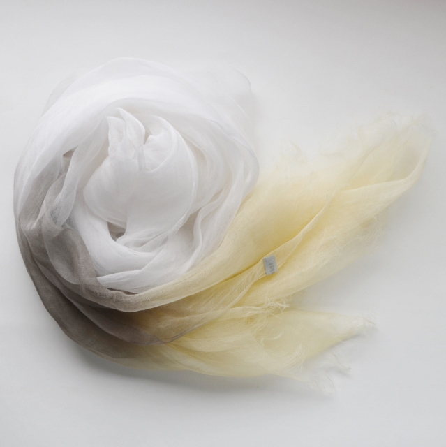 トンボの羽のように薄く透き通る、麻100%のストール。手染めのグラデーションが美しい一枚です。日本製ならではの繊細さが魅力です。