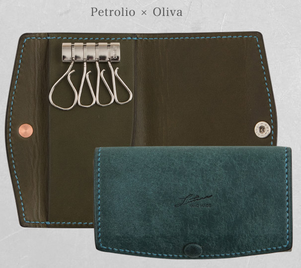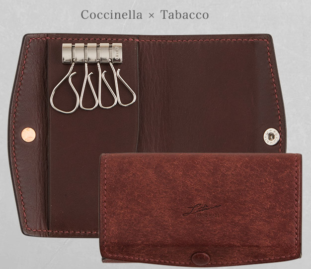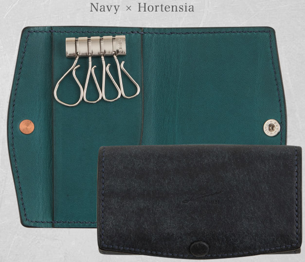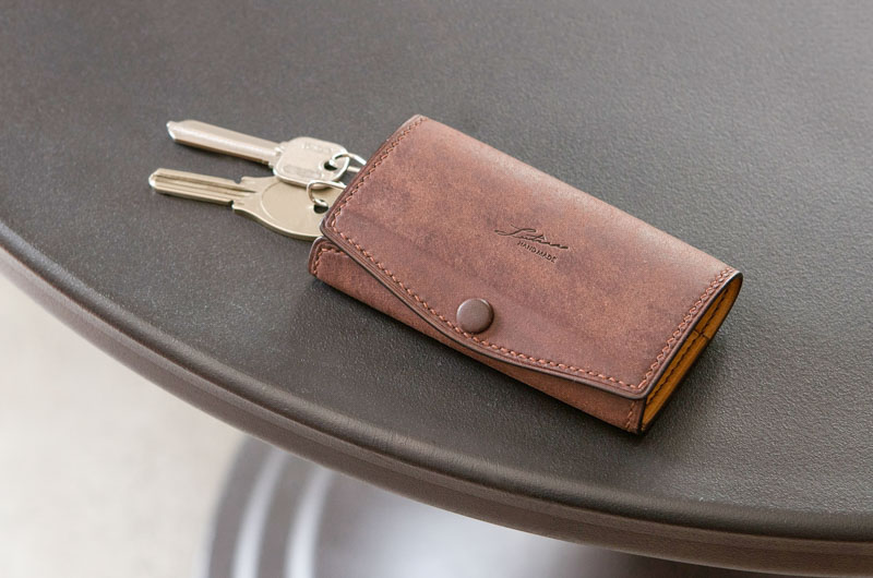 五色のカラーバリエーションから選べて、他にはない特徴的な素材感のプエブロレザーと滑らかで美しいスムースレザーで作られています。職人の高橋秀行さんが裁断から裁縫・仕上げまで全工程を手作業で行なっている、こだわりのイタリアの革を使用したキーケース。