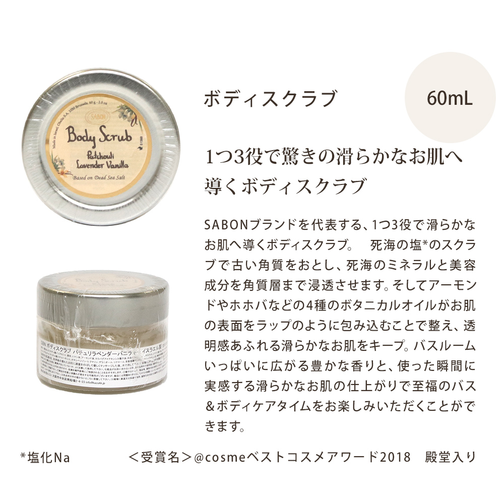 | 内容量 | ボディローション:50mL ハンドクリーム:30mL ボディスクラブ:60g |
