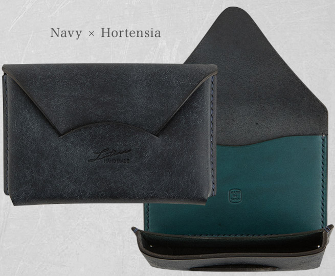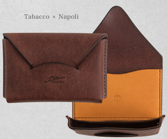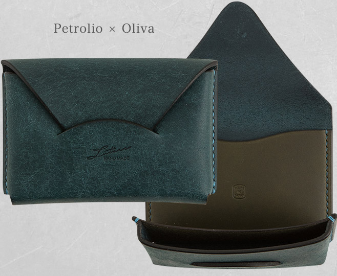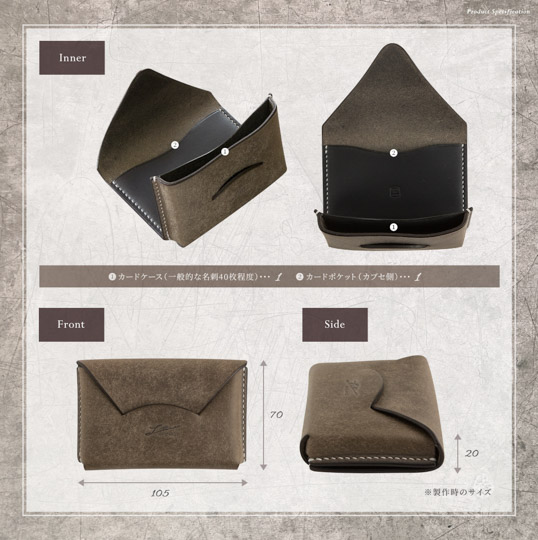 大口注文・法人のお問い合わせはこちら封筒のようなデザインになっている名刺入れです。 革はプエブロレザーと素材を生かし、肉厚2mmにする事で手に馴染みやすいです。 使えば使うほど美しいツヤ肌に変化していくので、手に馴染んでいきます。 全て職人さんによる手作業で作られている為、つなぎ目や切り目を美しく製作しています。 素材だけでなく、職人の技術で長く使い続けて部分的に擦れて切れても、一目一目内部で絡み合っているのでほつれにくくなっています。 フラップ側にカードポケットが付きます。