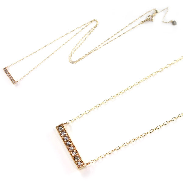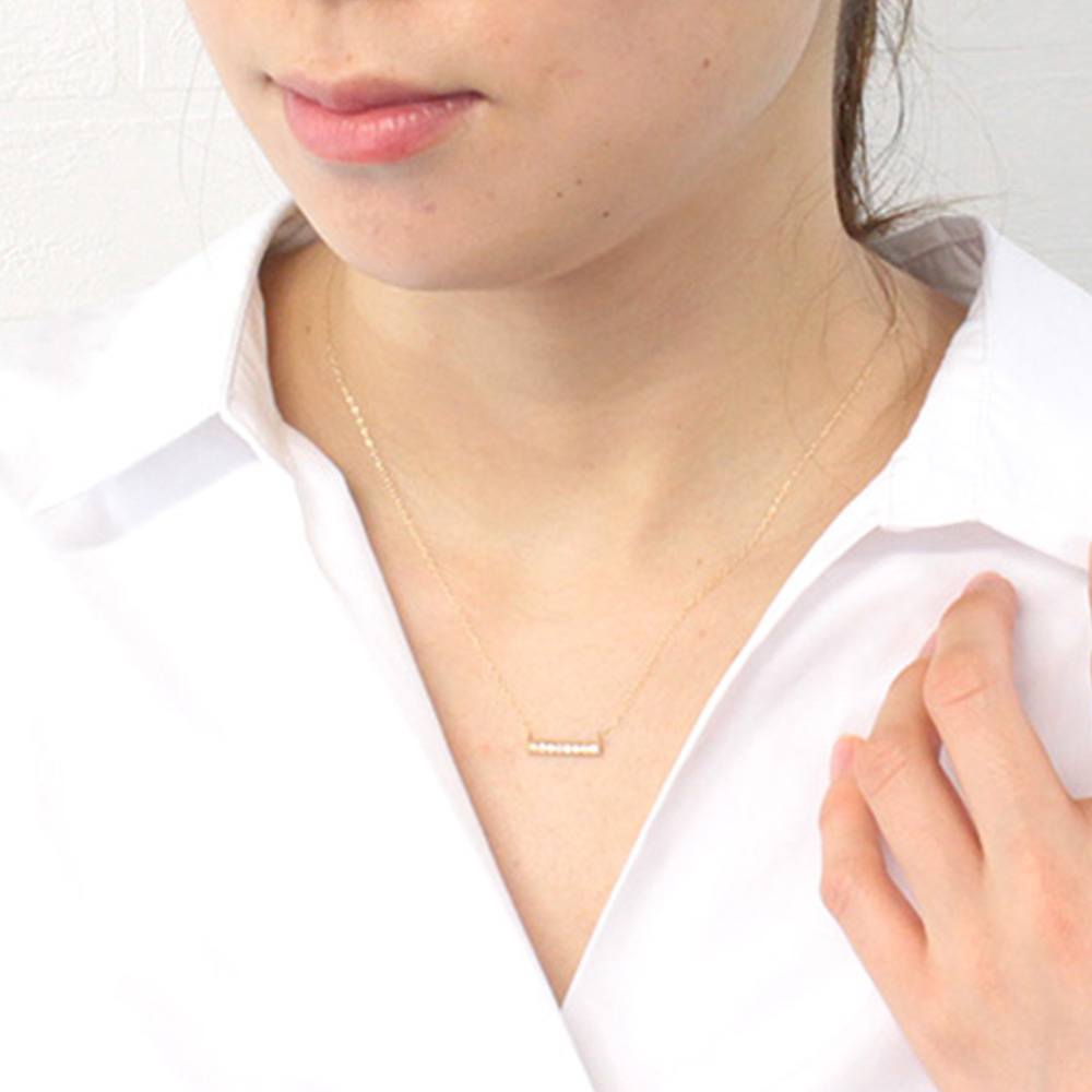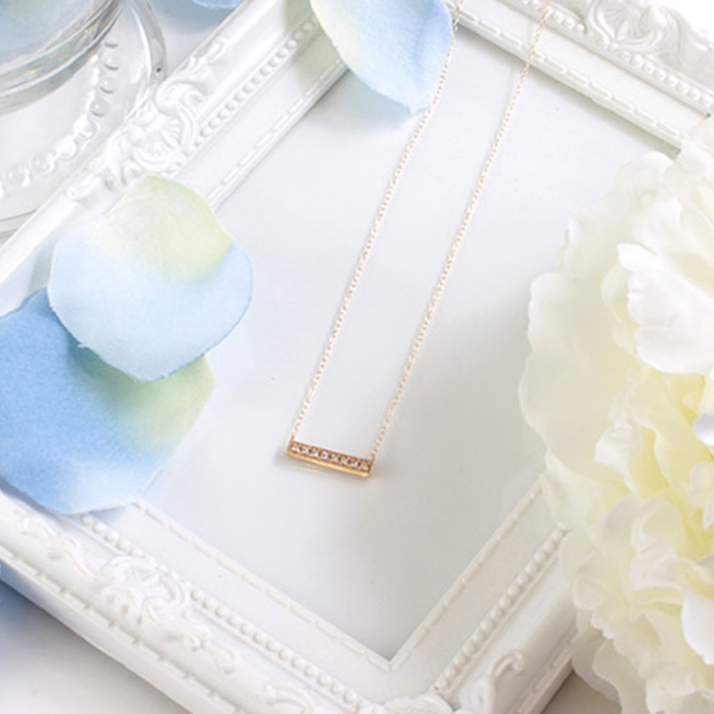 すっきりとしたラインにキュービックジルコニアがきらめく、モダンな印象のネックレス。洗練された胸元を演出するトレンド感です。カジュアルにもエレガントにも使えて、幅広い場面で大活躍。比較的こぶりなサイズ感で、他のネックレスとの重ね付けもおすすめです。