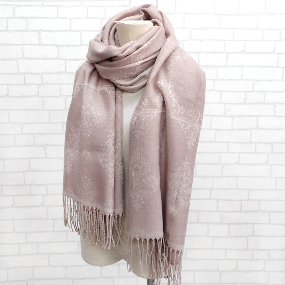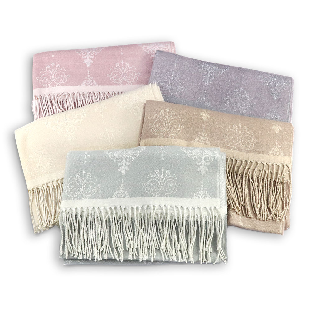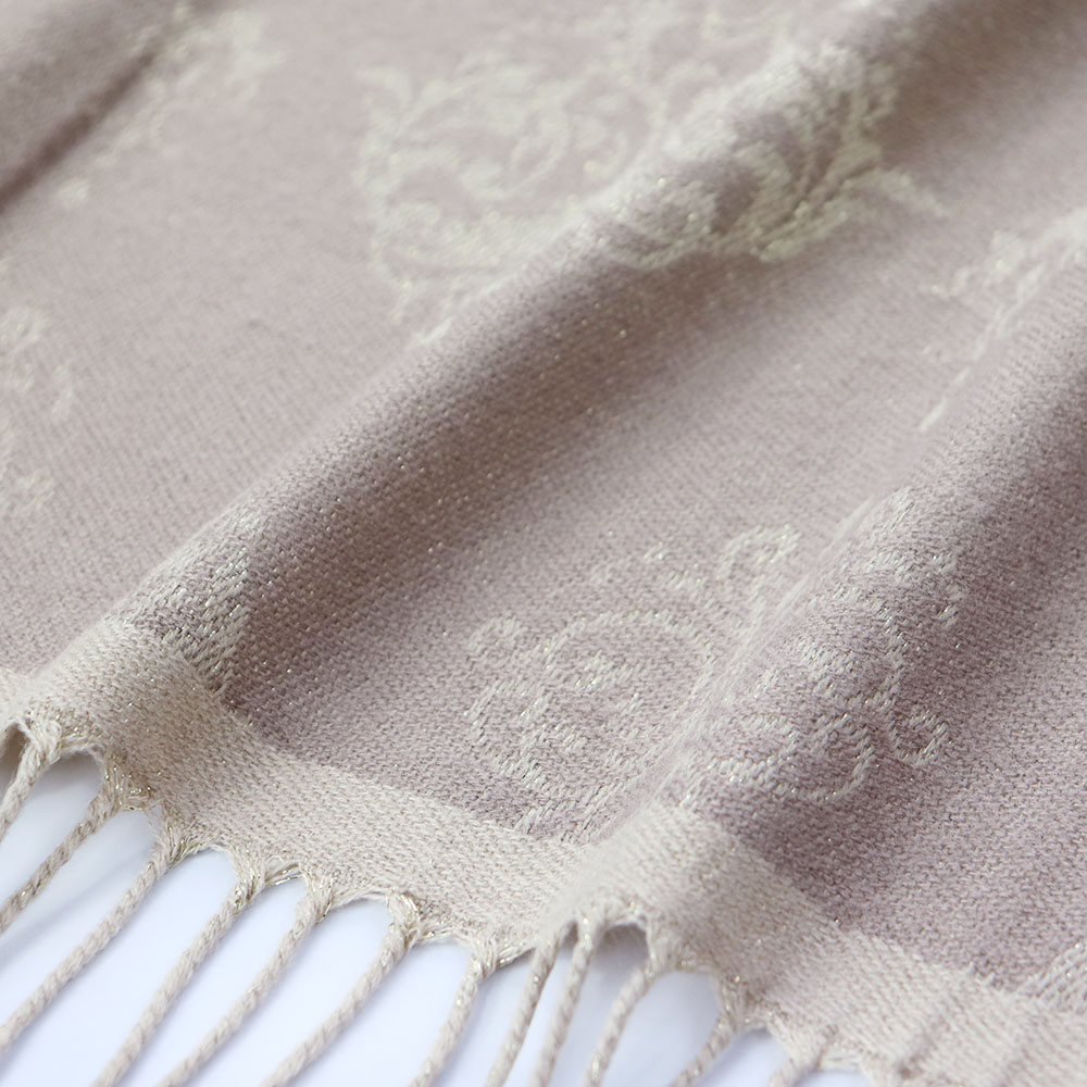 大口注文・法人のお問い合わせはこちらラメを使ったジャガードストールです。柄の部分から覗くラメがギラギラしない丁度良いラメ感はもちろん、女性らしいフェミニンなカラーバリエーションも人気です。ご家庭で手洗いでもできるので、毎日気軽にお使いいただけます。