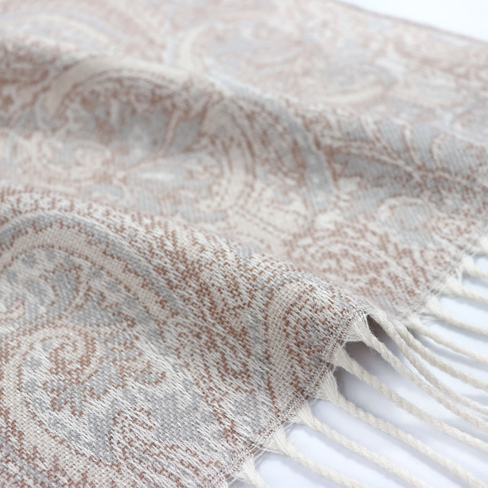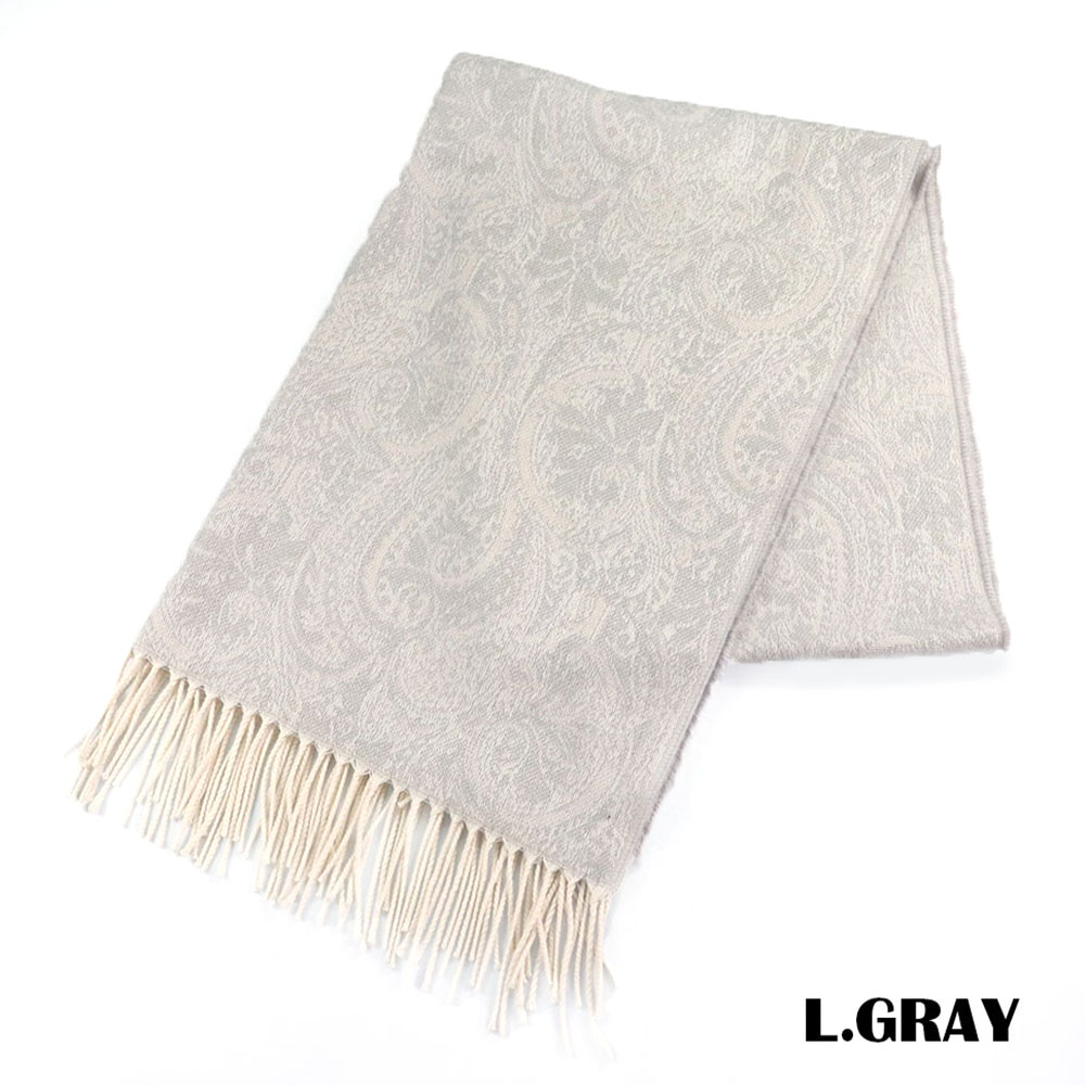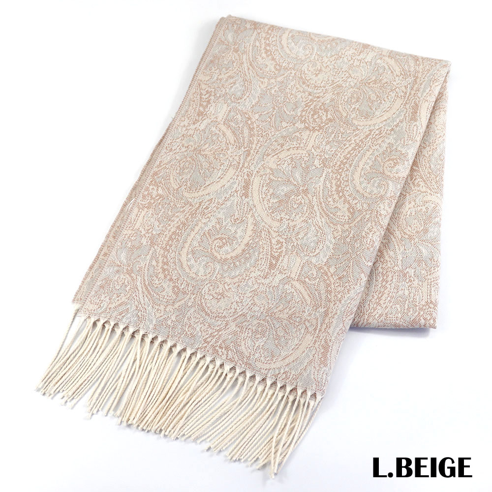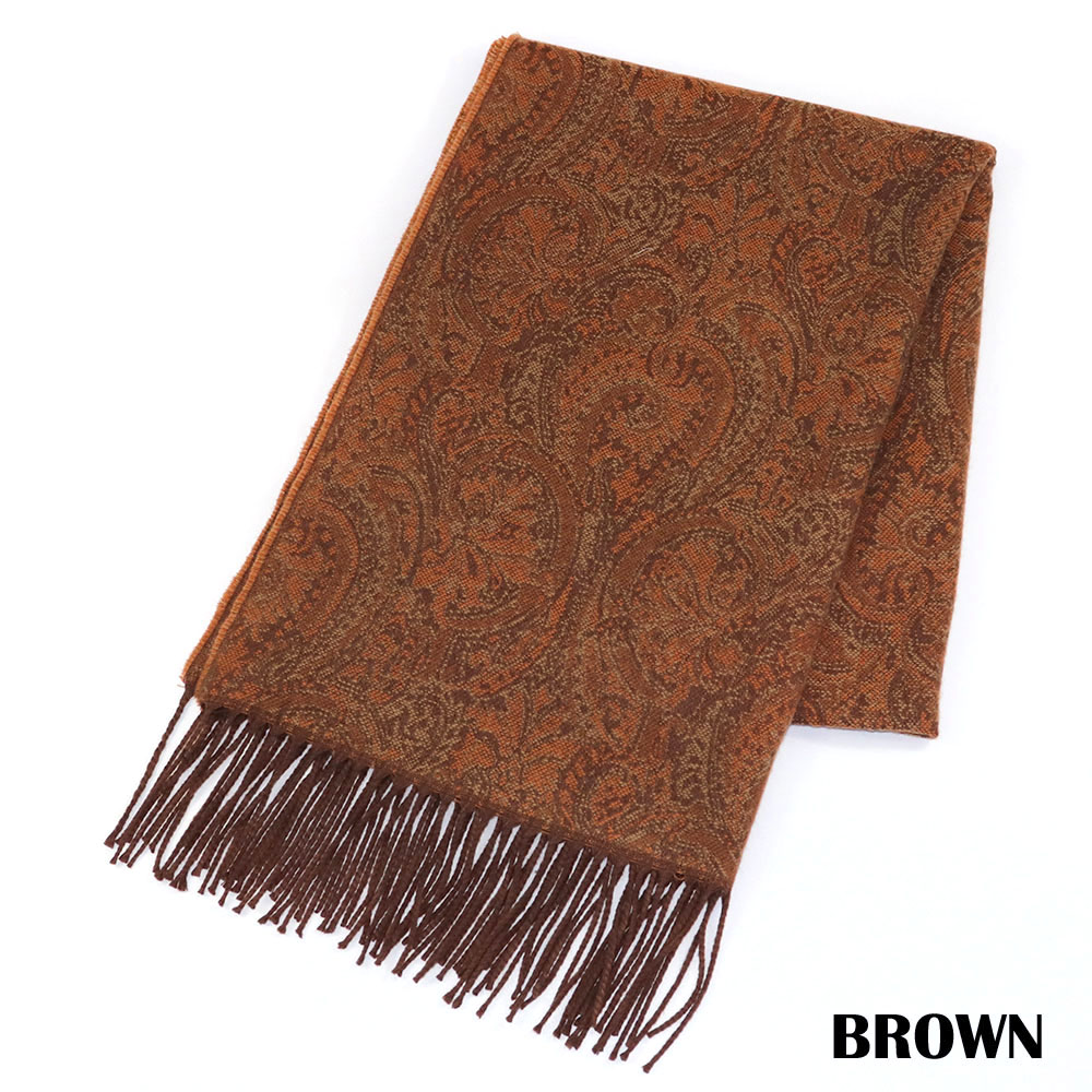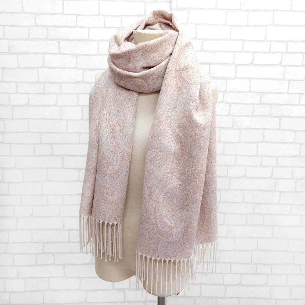 首に巻くだけでなく、肩掛けすることもできる大判サイズです。さりげないペイズリー柄なので、小物でペイズリー柄に挑戦したい方にもおすすめです。細めのフリンジ仕様もより華やかなイメージなります。