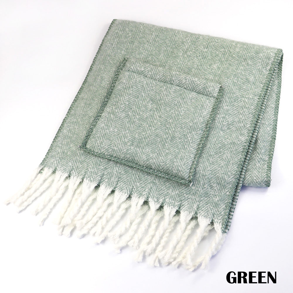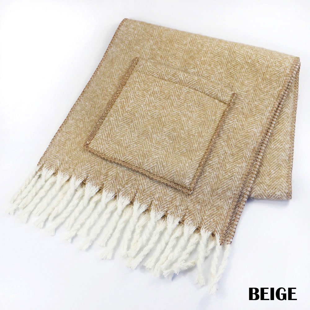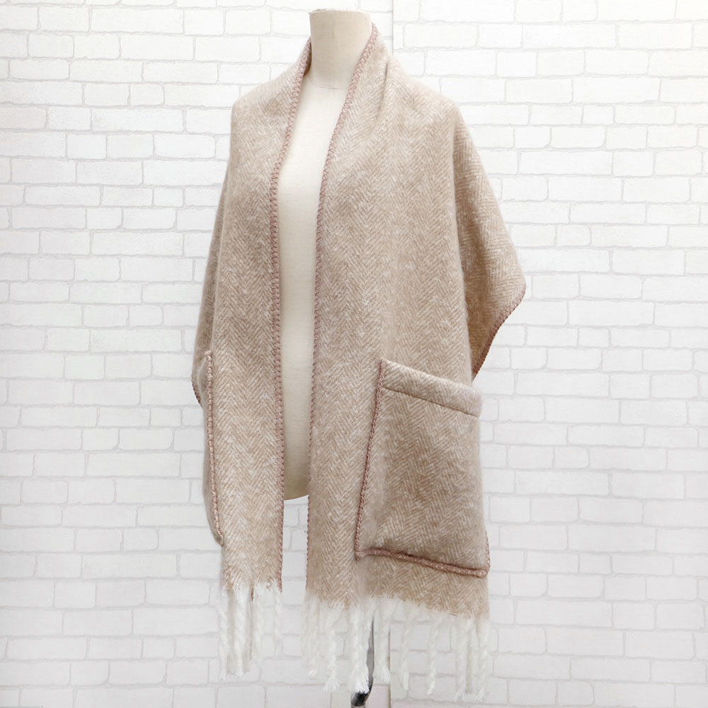 大口注文・法人のお問い合わせはこちらトレンドのボリュームフリンジストールにポケットを付けたストールです。起毛することでよりふっくらとした風合いに仕上げています。ストールとポケットの縁取りや、フリンジのカラーが異なるのもポイントです。ご家庭で手洗いでもできるので、毎日気軽にお使いいただけます。