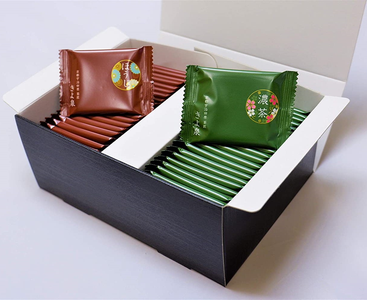京都府宇治田原町からお茶を使った商品をお届けする「京都きよ泉」の宇治のチョコレートです。抹茶は石臼挽きの一番茶のみを使用し、ほうじ茶は「砂炒り焙煎」で炒った茎ほうじ茶を贅沢に使用しています。お茶の香りと味わいを甘みを存分に楽しむことができます。