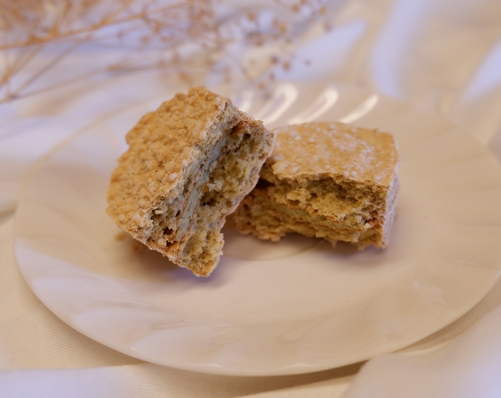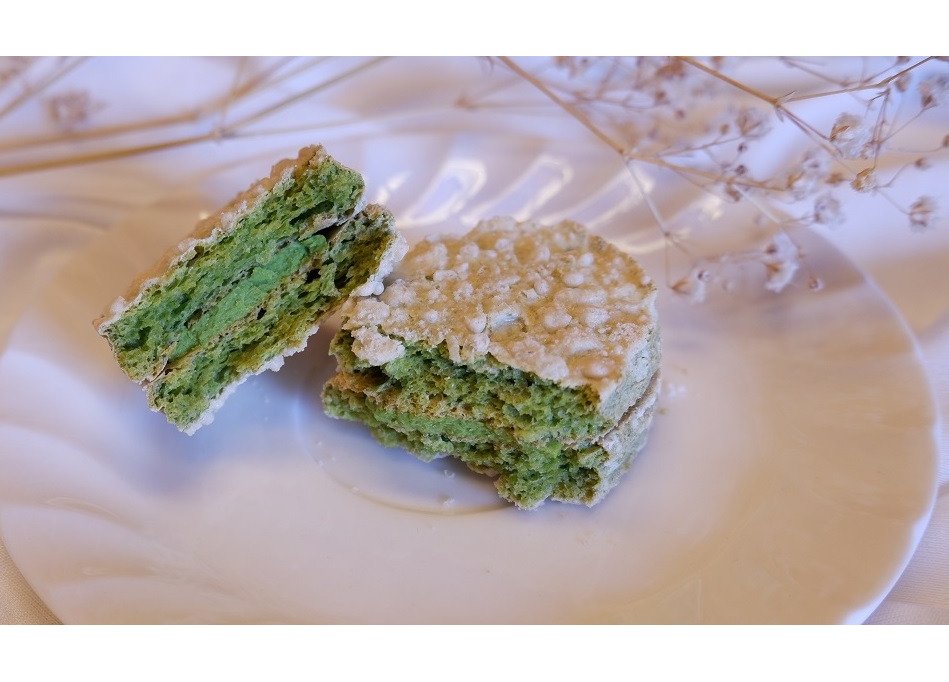 ダクワーズとは、アーモンド風味のメレンゲを使った焼き菓子です。生地と中のクリームには「きよ泉」オリジナルの宇治抹茶と、香り高い茎ほうじ茶を使用しています。外はサクサク、中はしっとりとした食感です。