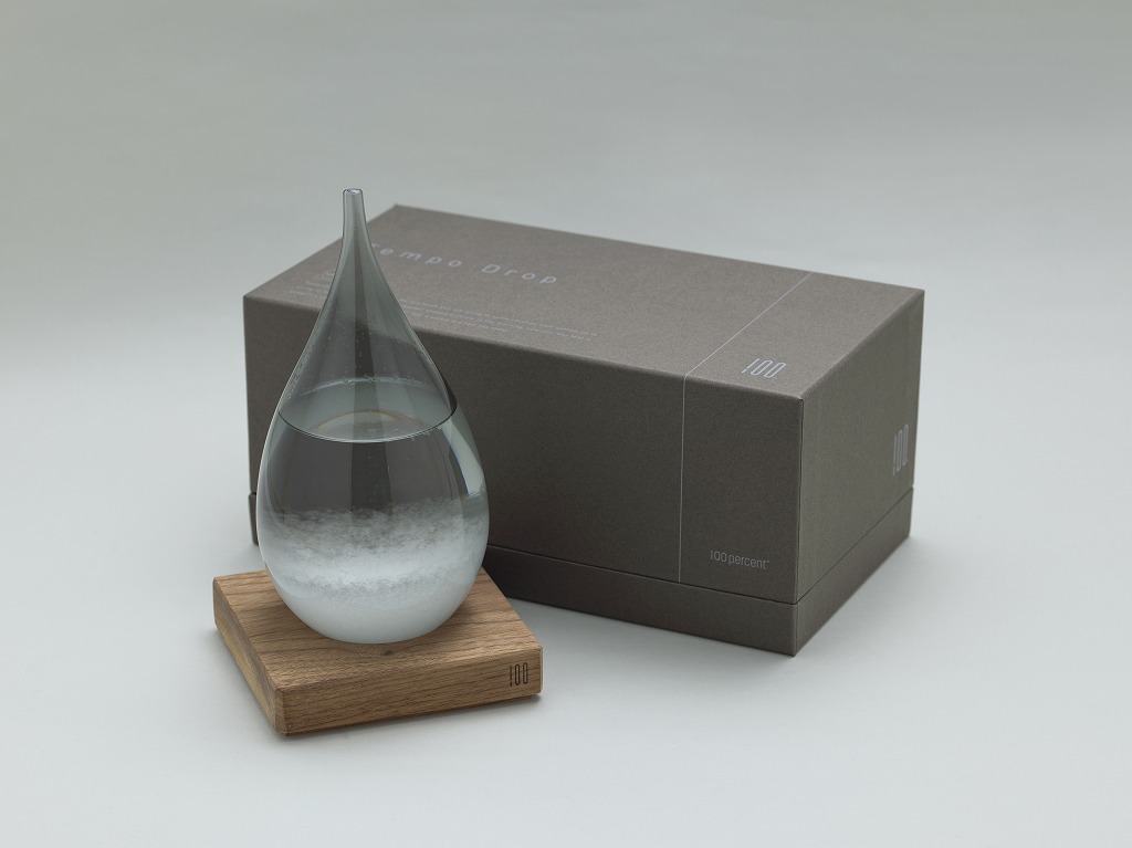 「Tempo Drop」は、ストームグラスと呼ばれ19世紀に航海士等が使用していた天候予測機です。樟脳(クスノキのエキス)やエタノール等をガラス菅に密封して作られており、 気温の変化に反応して起きる結晶を観察する事で、航海に役立てられていました。ジュール・ヴェルヌの小説「海底二万マイル」に出てくるノーチラス号にも設置されています。 その後の科学の発展に伴い、実際には結晶化現象については謎が多い事がわかり、 いまだ詳細は研究途上です。現代では予測機としての実用は難しいですが、 季節によって景色が変わるように、日々変化する結晶の様子を「Tempo Drop」でお楽しみください。