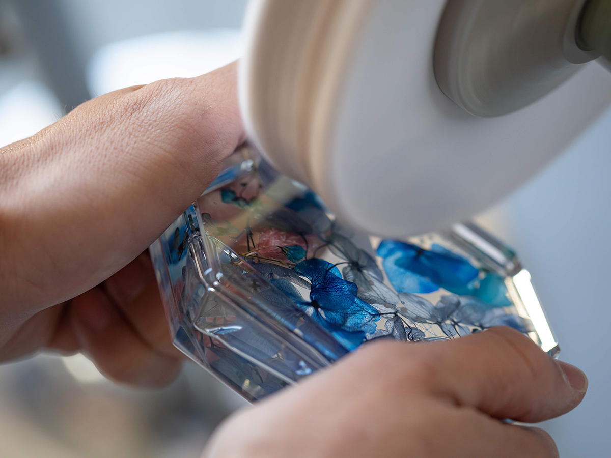 繊細な作業が要するアクリル板の加工は、作業過程においても細心の注意が必要です。曲がったり、傷がつくだけで光の透過性が変わるので、オブジェの中に花材を閉じ込めるのは難しく、職人と共に進めることでようやく完成しました。大量生産は難しいこだわりのシリーズです。