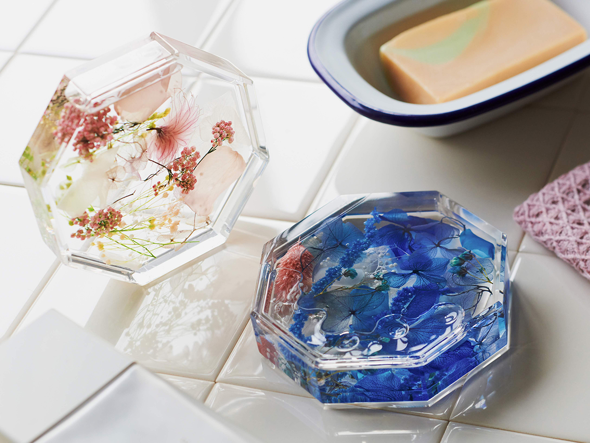 従来のガラス瓶にオイルと花材を入れて蓋をするハーバリウムは鑑賞するものでしたが、こちらの商品はアクリルにオイルと花材を入れることで、蓋がなく、どこからでも光を通し、お客様の好きな置き方で楽しむことができます。インテリアやオブジェとしてだけでなく、ペットの遺影や位牌などを置くステージやトレーとしても使えます。新しい形のハーバリウムとして大変人気です。