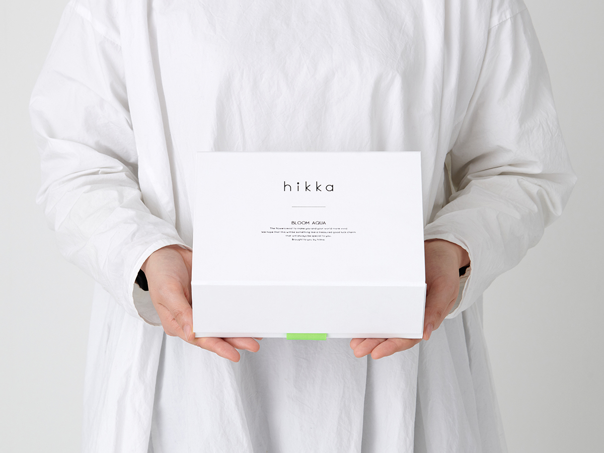使用しているお花は全て本物で、一つ一つが職人が全工程を手作業で行っています。世界に同じものはひとつとない「hikka」の世界観が凝縮されたこだわりのプロダクトラインです。 お花が少しでも美しく見えるようしっかりと選定を行い、小さなハサミを使用して可能な限り破れた花びらなど一枚一枚カットしています。浮き沈みや配置など細部にまでこだわったデザイナー渾身のデザインです。