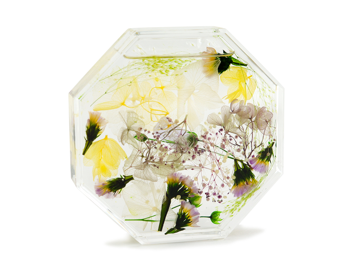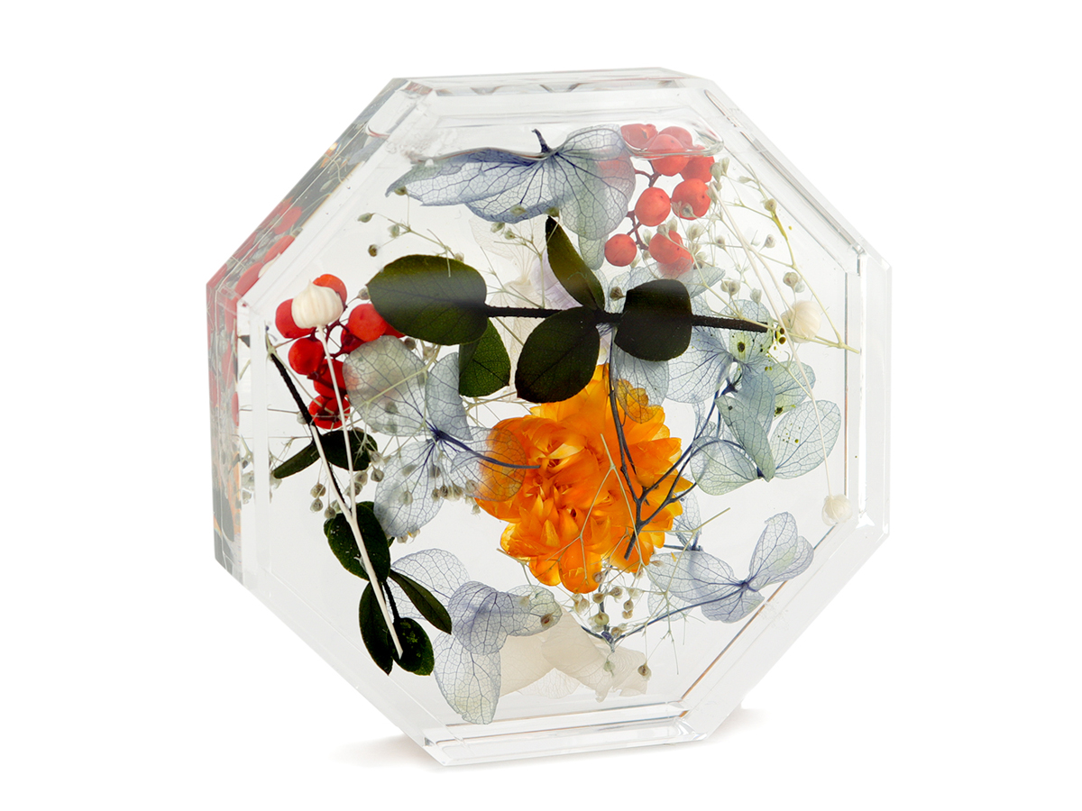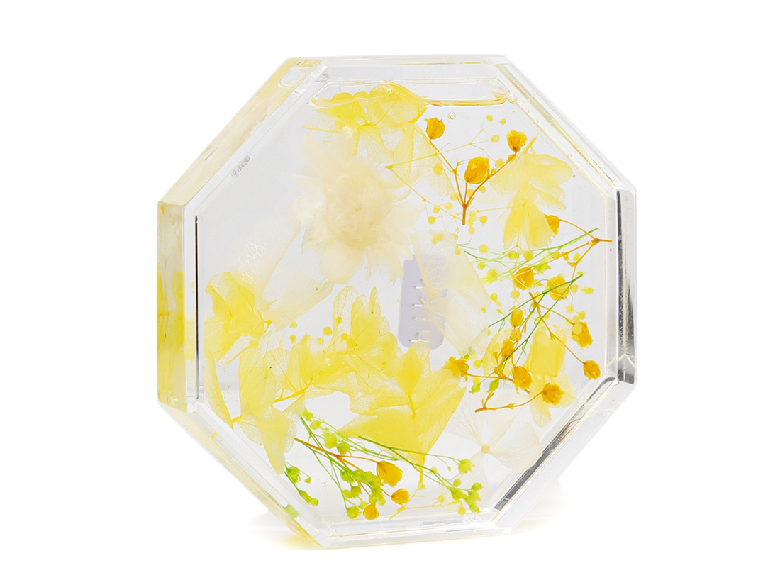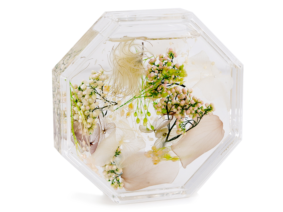 ひとりひとりの飛躍を願うお花のプロダクトブランド「hikka(ヒッカ)」のブルームアクアオクタゴンSです。本物の花を透き通った8角形のアクリル板の中にシリコンオイルと共に閉じ込めました。インテリアだけでなく、アクセサリーを置いてプレートとしてもお使いいただけます。