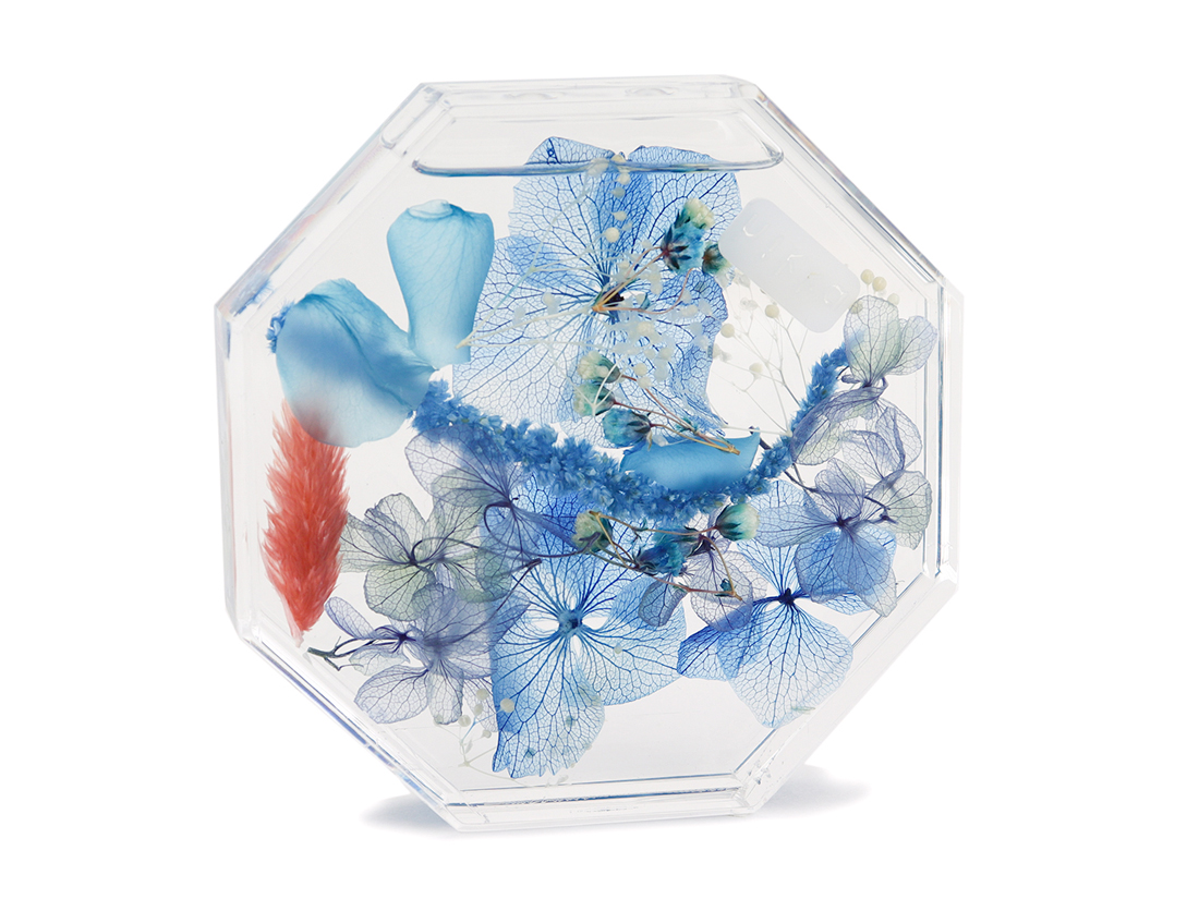大口注文・法人のお問い合わせはこちら「BLOOMAQUA」は、透明度の高い8角形のアクリルで本物の花を封じ込めたインテリアオブジェです。シリコンオイルの中に漂う色艶やかな花々と、宝石のようなクリアな佇まいは箱を開けた瞬間に思わず息をのむほどの美しさです。お気に入りの空間や、デスク周りの装飾はもちろん、大切な人へのギフトやお礼返しなどにもおすすめです。
