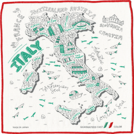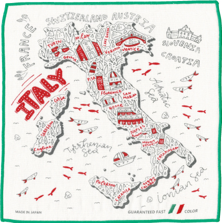 ガーゼ、綿基布、パイルの3層構造のタオルハンカチ。 糸に撚りをかけていない無撚糸パイルを使用しているので、ふっくらと柔らかな肌触りが気持ちよく、吸水性と保湿にも優れています。裏面は無撚糸パイルとなります。 手書き風のイタリア地図、国旗の刺繍入りです。