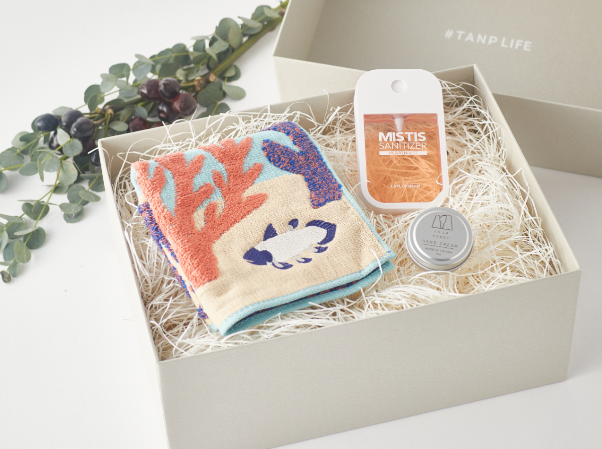 ・ハンドクリーム ・タオルハンカチ ・除菌スプレー ・TANP LIFE専用BOX のセットです。