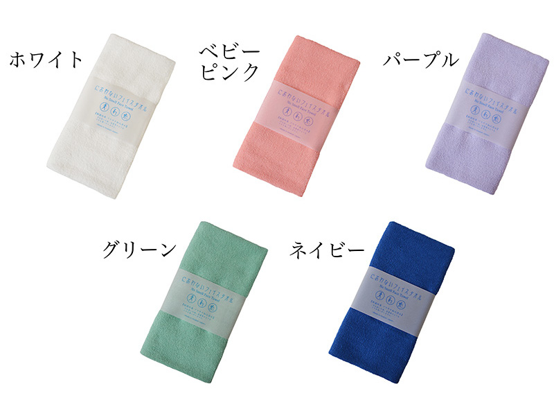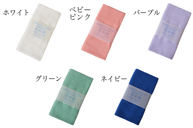 ホワイト:タオルの基本カラーで、まよったらこの色がおすすめです。 パープル:ラベンダーカラーです。 グリン:ジムやヨガなどに行かれる方に人気のカラーです。 ベビーピンク:ピンクの中でベビーのような柔らかいピンクです。 ネイビー:一番人気カラーで男性はもちろん、女性にも人気のカラーです。