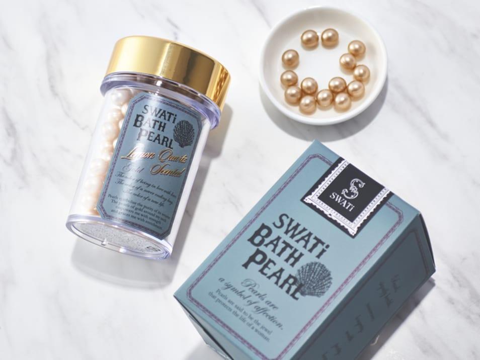 SWATiのパールをモチーフにした入浴剤・身体と髪をみずみずしく、香りながらリフレッシュすることができるマーブル ボディ&ヘアフルーツウォーター・保湿成分(フィフロー・イノンド種子エキス)を配合したハンドクリームの3点セットです。