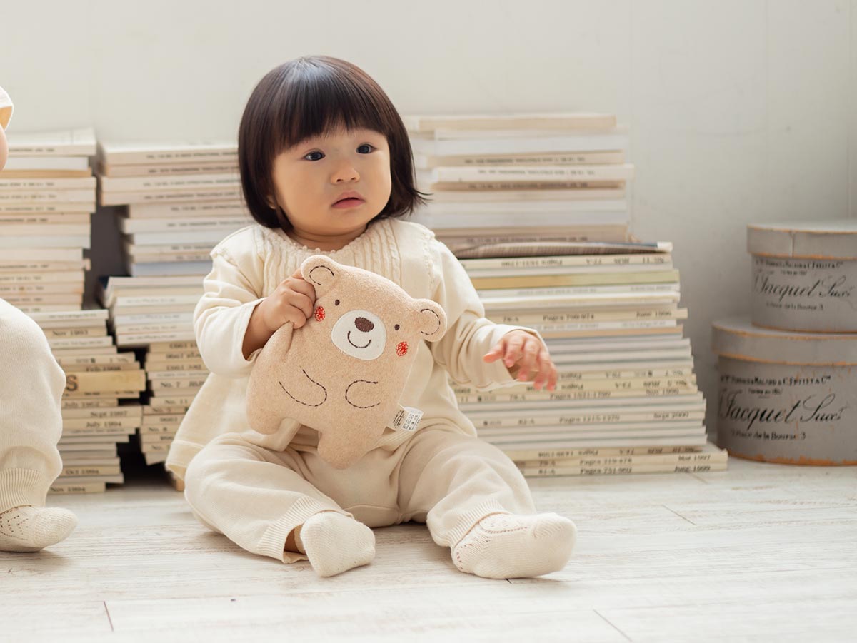 くまの名前は「コットン」。ぷくっとしたかわらしいフォルムなので、あかちゃんはきっと抱っこしたくなります。鈴入りなので振っても、さわっても楽しい「クマのコットン」です。ずっとお子様のお友達になってくれますね。