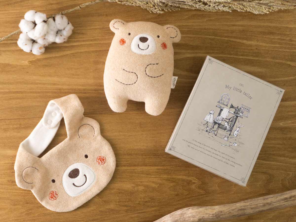 オーガニックコットン100%の心にも体にもやさしい商品を作る「Amorosa mamma(アモローサマンマ)」のくまのだっこラトルとスタイです。「クマのコットン」をモチーフにした鈴入りラトルとニコニコ笑顔のスタイは、赤ちゃんのお出かけにも持ち歩きたくなるアイテムです。