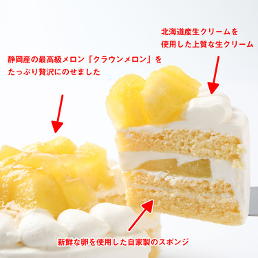 究極の温室クラウンメロンに合わせるホイップクリームは北海道の自然豊かな十勝平野で育まれた最高グレードの生クリームを甘さ控えめにブレンドしてクラウンメロンの自然の甘みを生かすホイップクリームにしております。 新鮮な卵だけを使用してスポンジ生地を作っており、卵の持つ膨張力だけでしっとりふんわりした無添加のスポンジ生地に熟練したパティシエが焼き上げています。