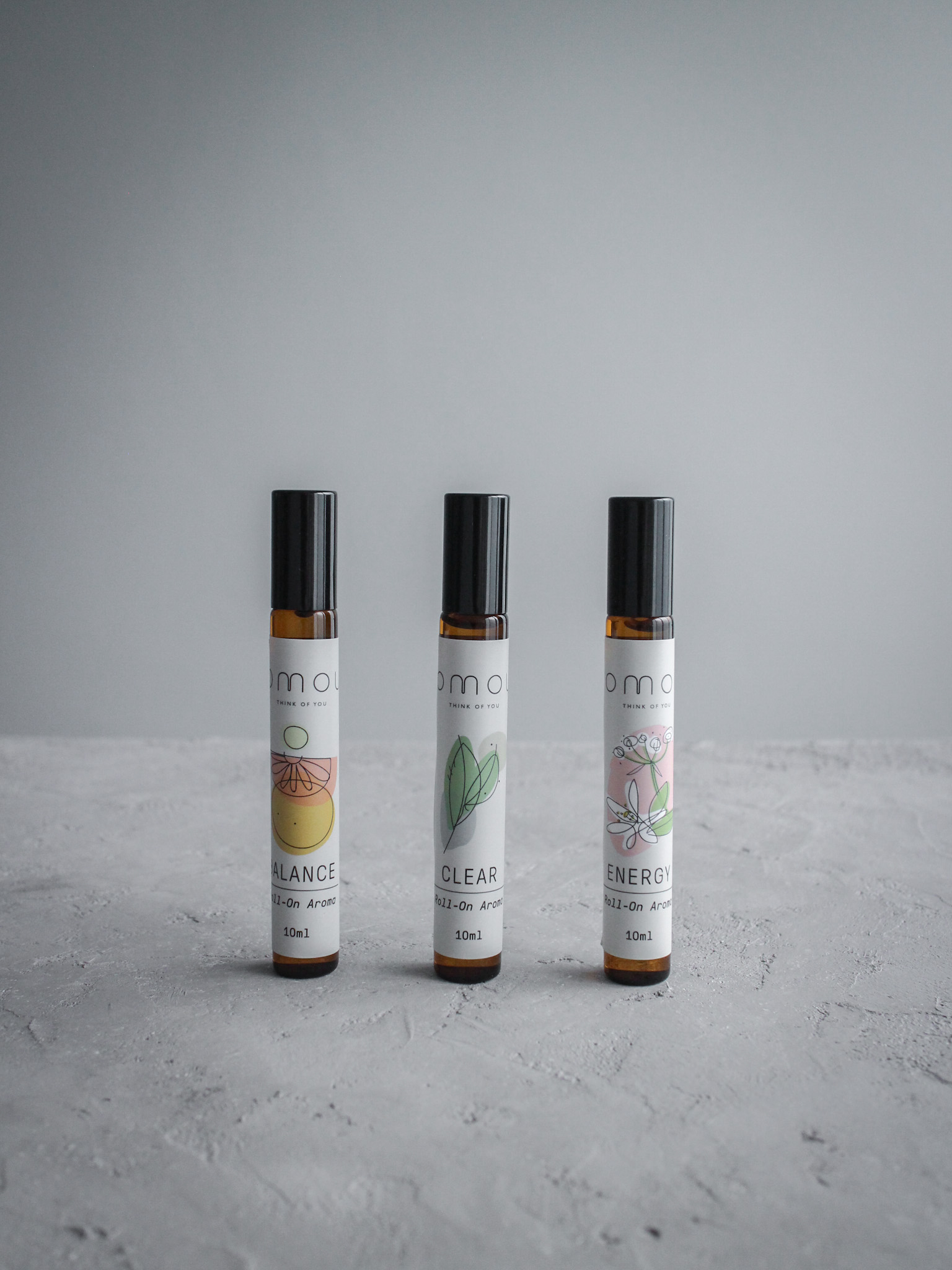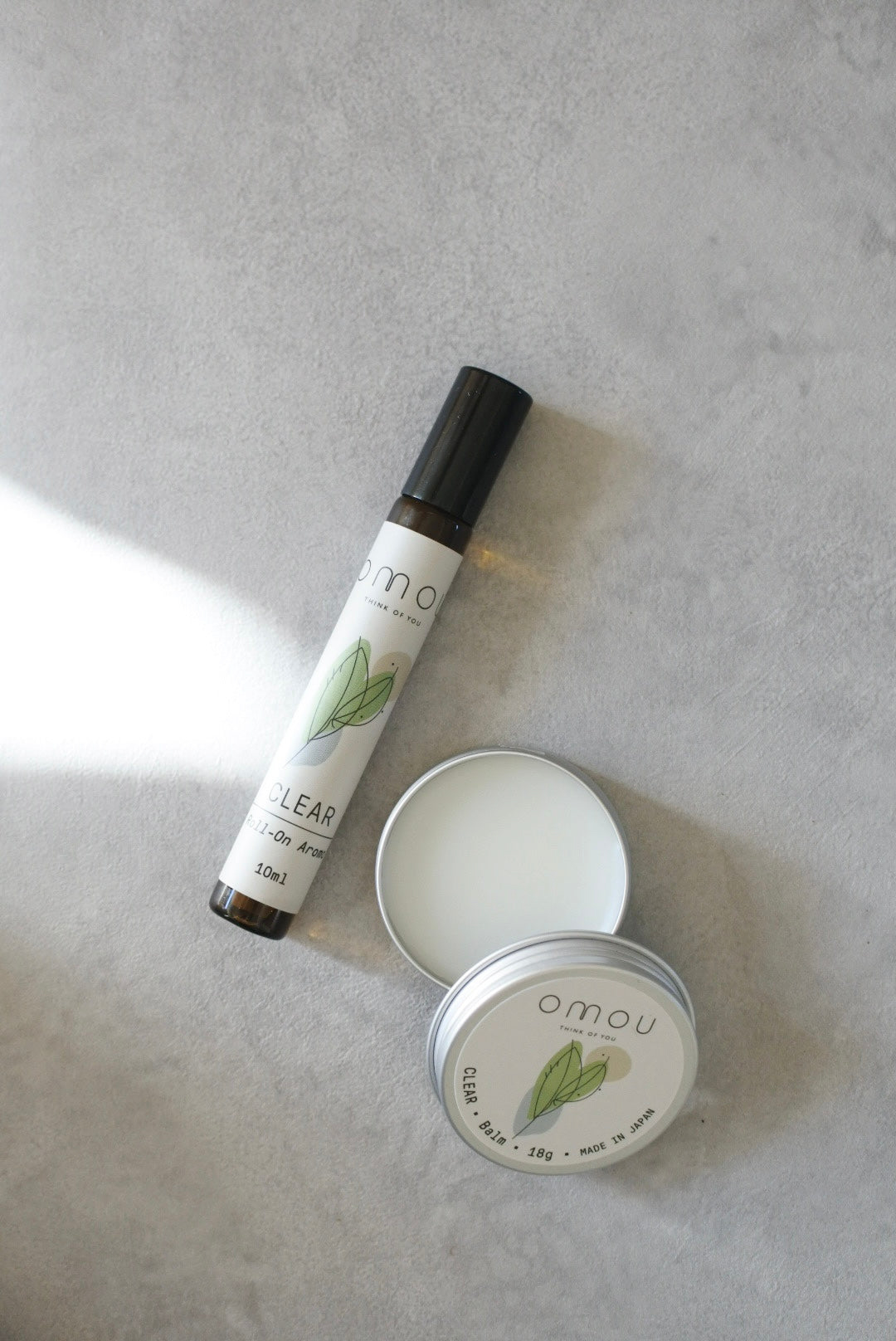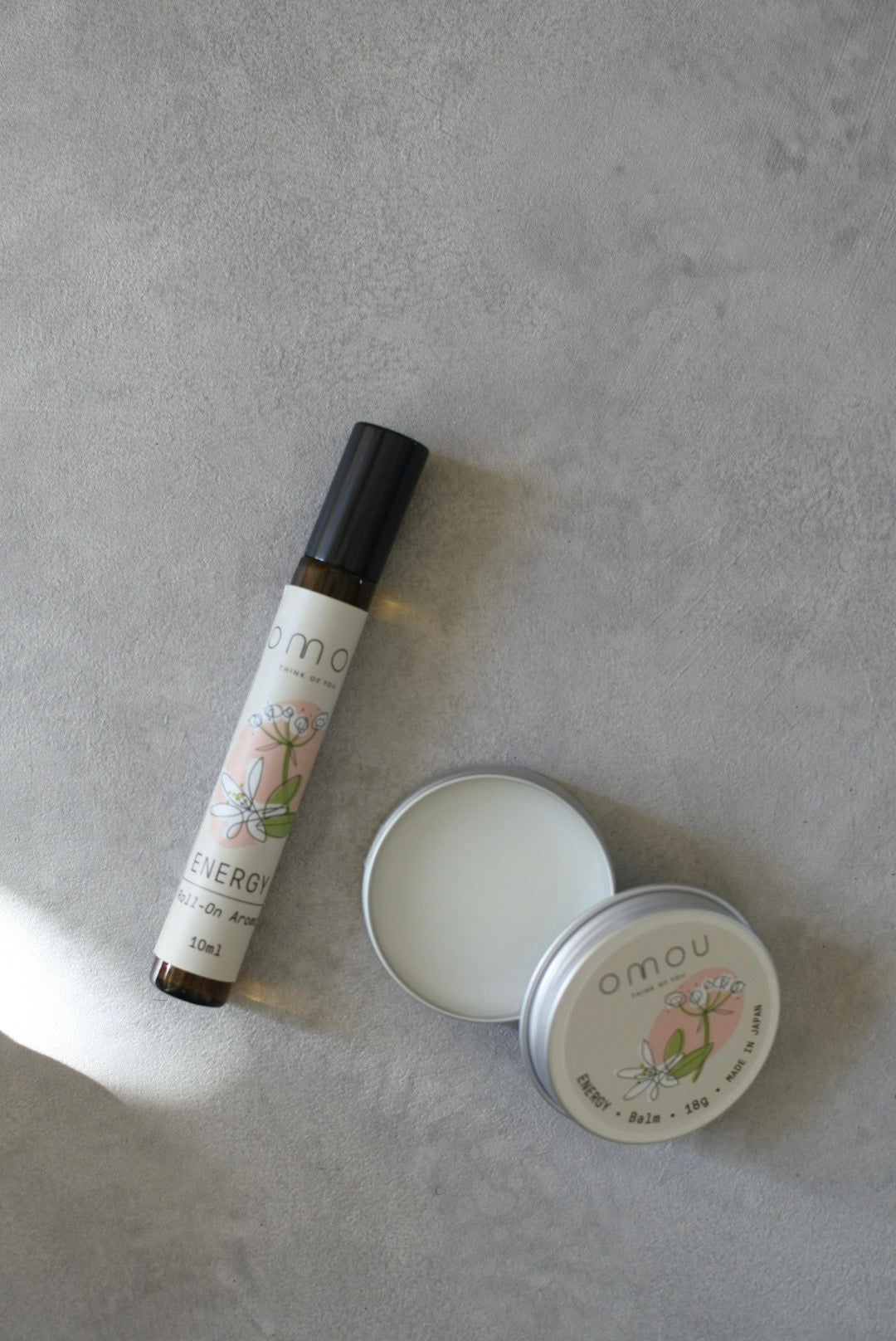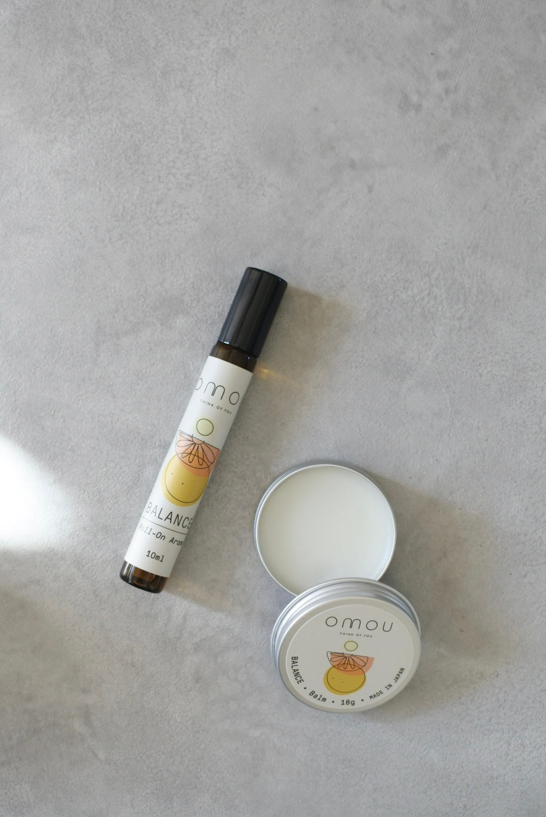 ホホバオイルとマカデミアナッツオイルを配合した、とろけるように馴染む使い心地のバームと、サトウキビから創られたスクワランオイルを使用したロールオンアロマのセットです。「バランス」「クリア」「エナジー」の3つからお選びください。