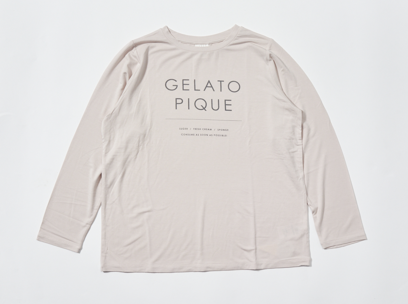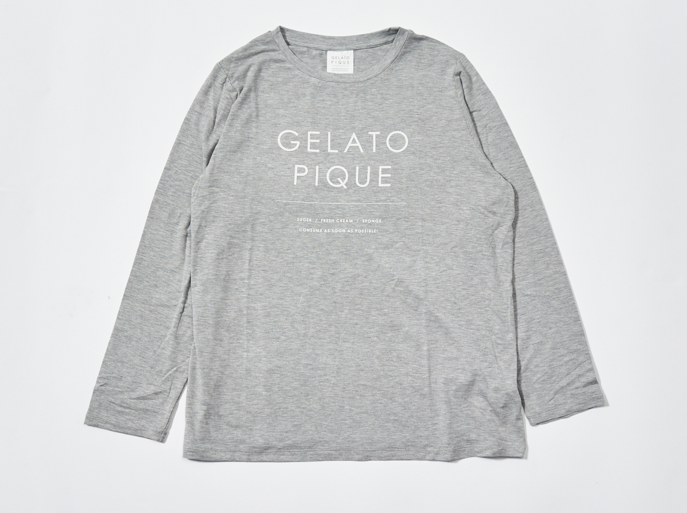 スイーツを作る際に必要な材料、SUGER・FRESH CREAM・SPONGEをワンポイントにプリントし、「GELATO PIQUE」らしい甘さを効かせています。ストレッチ性のある滑らかなレーヨンを使用してるので、肌当たりが良く、快適な着心地が叶います。一枚ではもちろん、ベーシックなデザインなのでパーカーやカーディガンのインナーとしても重宝し、1年中活躍します。