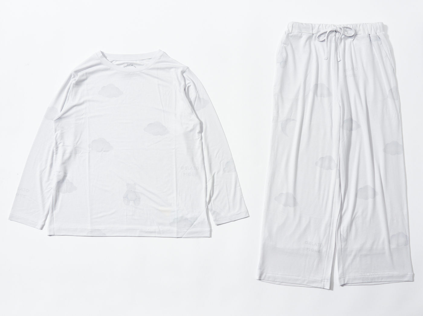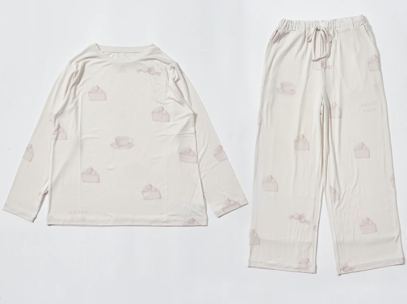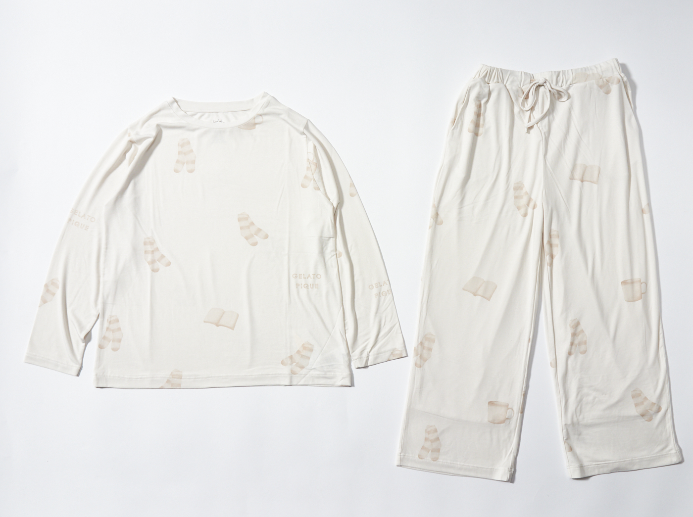 【10%OFF セール中】ゆったりめのシルエットがリラックスタイムにぴったりの「gelato pique(ジェラートピケ)」のカットソー&ロングパンツセット。伸縮性がよく肌触りも柔らかな「リサイクル天竺ECOVERO」素材を使用しています。カラーによってプリントされているモチーフが異なり、ピンクにはケーキ、オフホワイトにはソックス、ブルーには雲が描かれています。