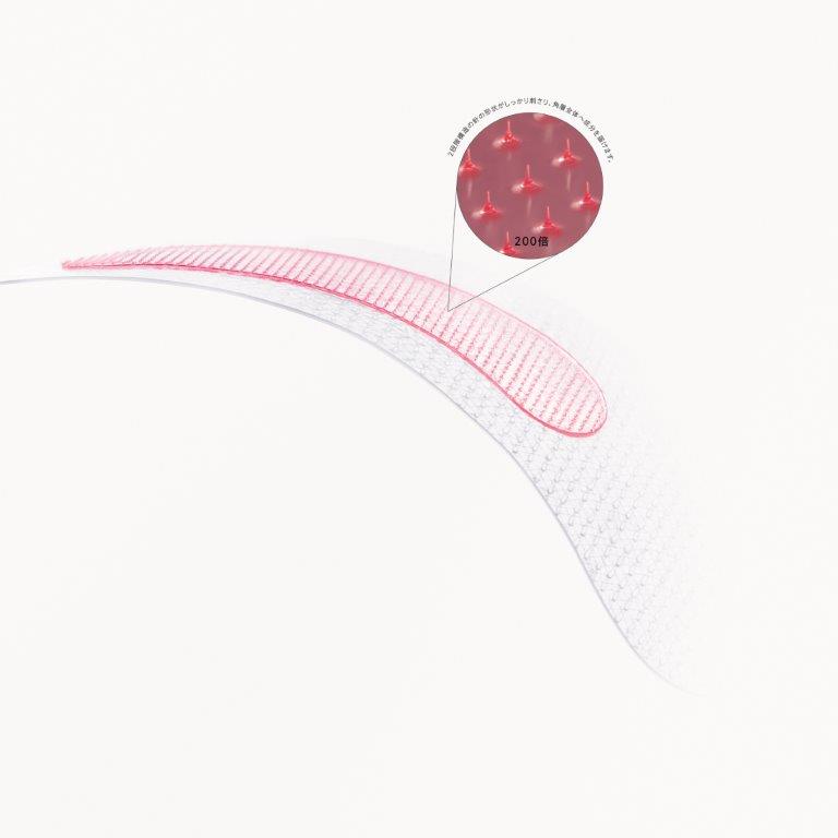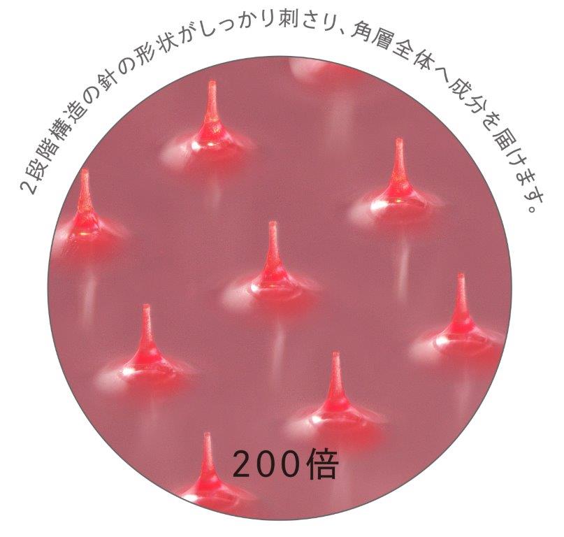 針状に結晶化したヒアルロン酸を直接角層へ注入するマイクロニードル技術に、独自の炭酸テクノロジーをかけ合わせた「炭酸マイクロニードル」。国内で徹底管理・一貫生産した発酵ヒアルロン酸※2が角層でじっくり溶解すると同時に、角層内部で炭酸が発生します。 ※1角層まで ※2ヒアルロン酸Na(保湿剤)