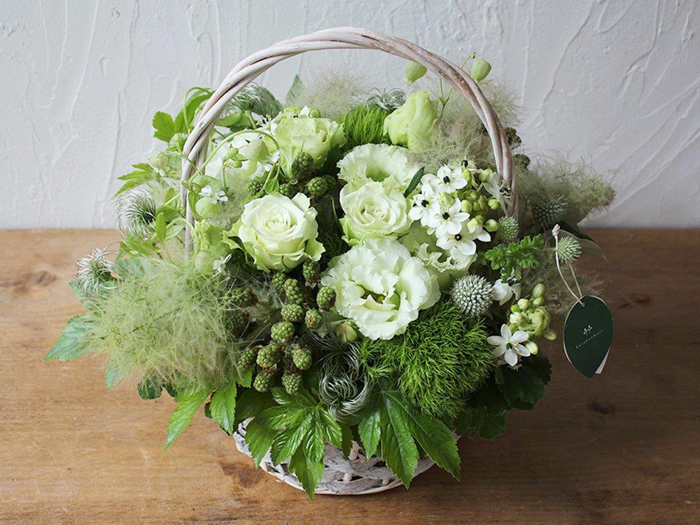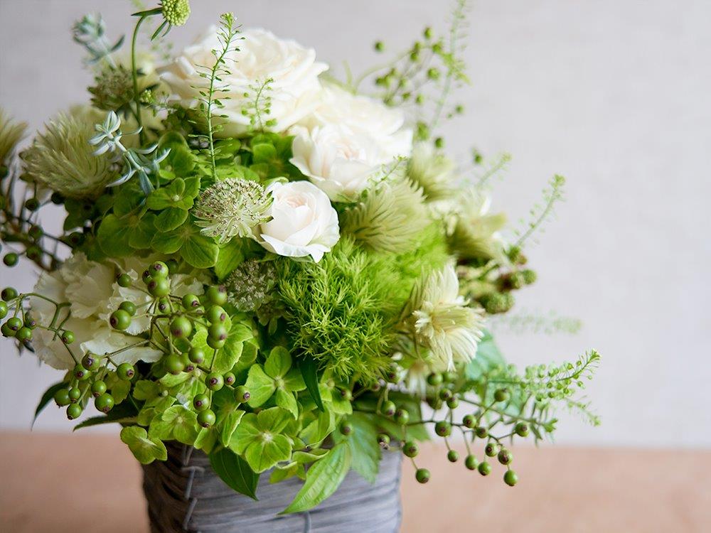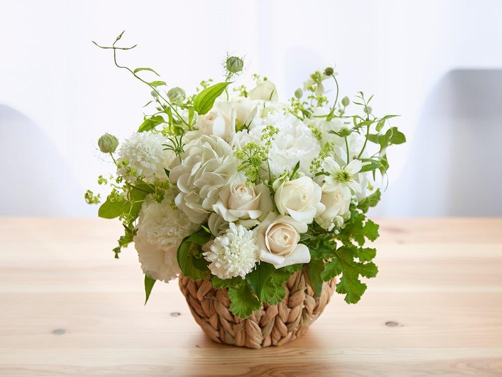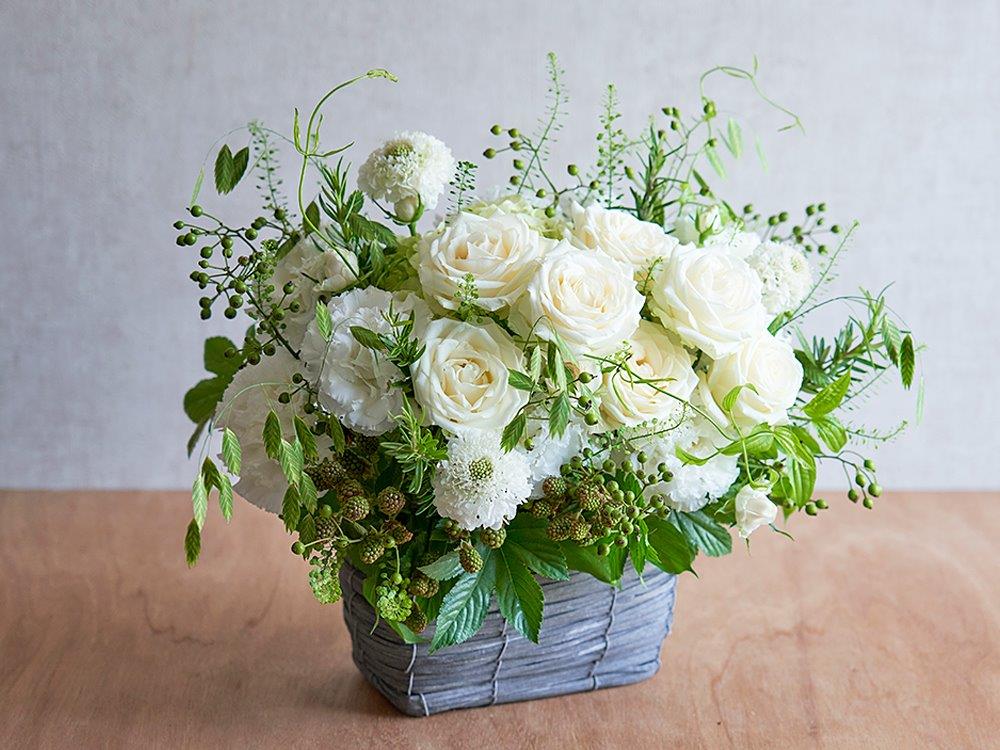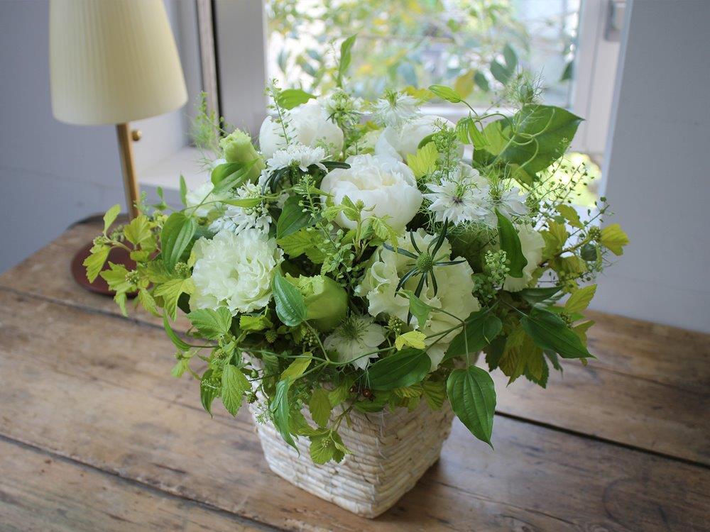 白と緑の草花を贅沢にあしらった大きめのアレンジメントがとても華やかな一品。ナチュラルな色合いはどんなインテリアにもマッチし、空間をとても華やかに演出してくれます!記念日のギフトとしてはもちろん、店舗や企業のお祝い花などの用途にもお使いいただけます。