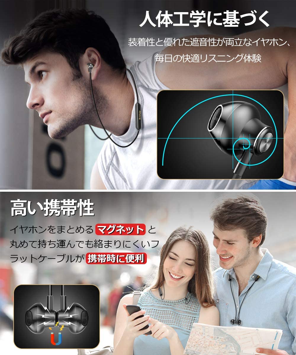 左右イヤホンにマグネットを搭載し、近づけたら、左右のイヤホンがすぐに密着。使用しない場合にそのまま首にかけて便利です。