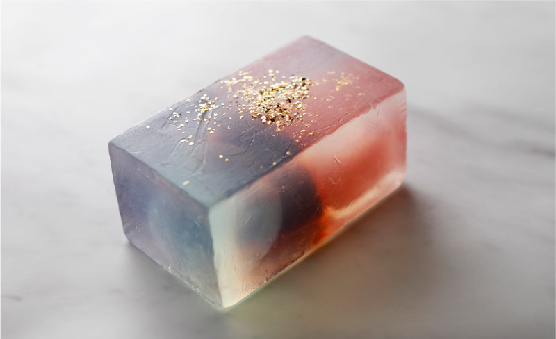 石鹸の中に透けて見える、ピンクと黒が幻想的。 ピンク色は「ピンククレイ」、黒は「カカオパウダー」です。ピンククレイの優れた洗浄力とカカオの保湿力で素敵な肌に仕上げてくれます。