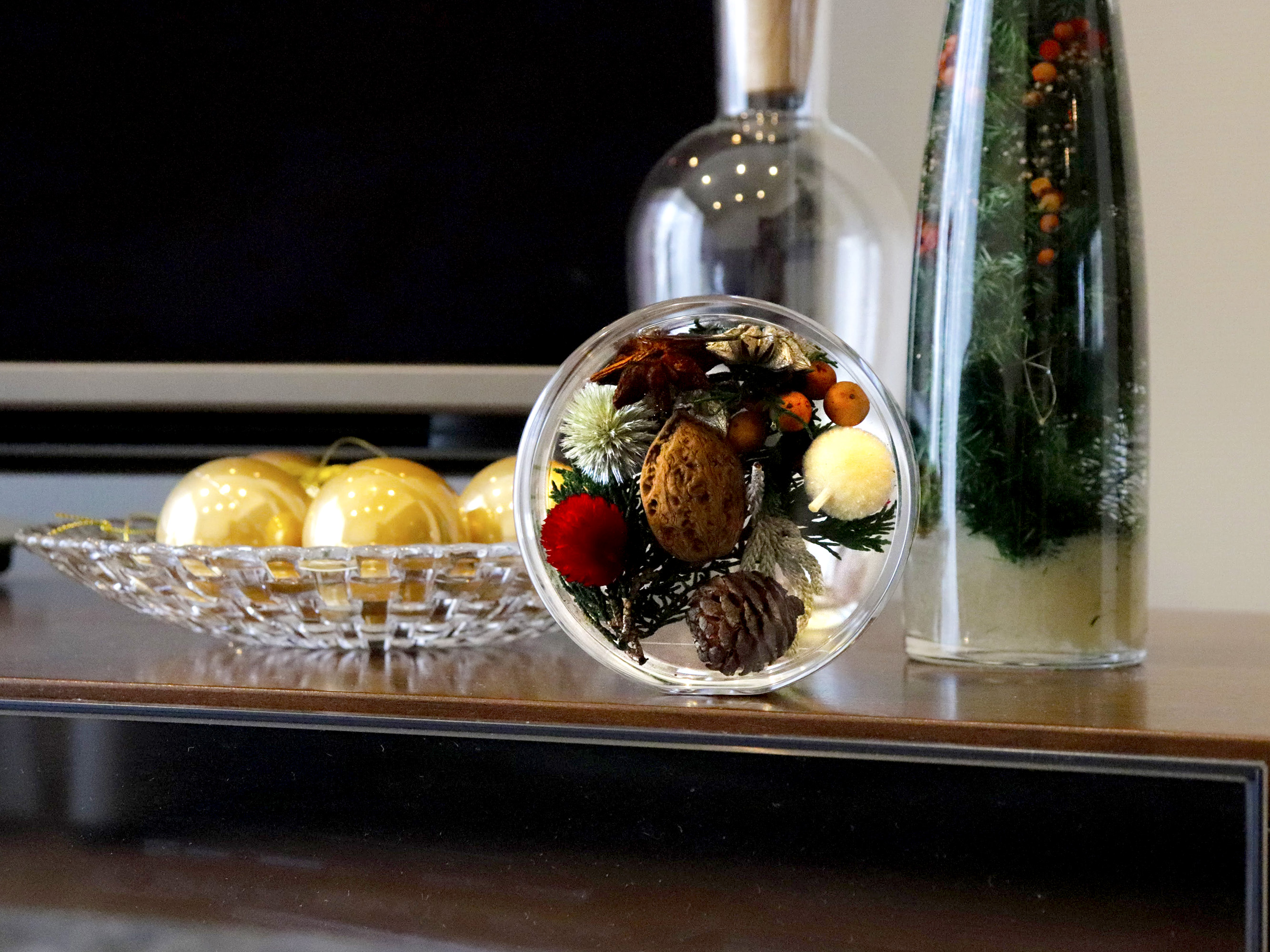 「花を味方に」をブランドメッセージに誕生した、舞い上がる花びらのようにひとりひとりの飛躍を願うお花のプロダクトブランド「hikka(ヒッカ)」。透明度の高いアクリルで本物の花を封じ込めたインテリアオブジェのクリスマス限定商品です。