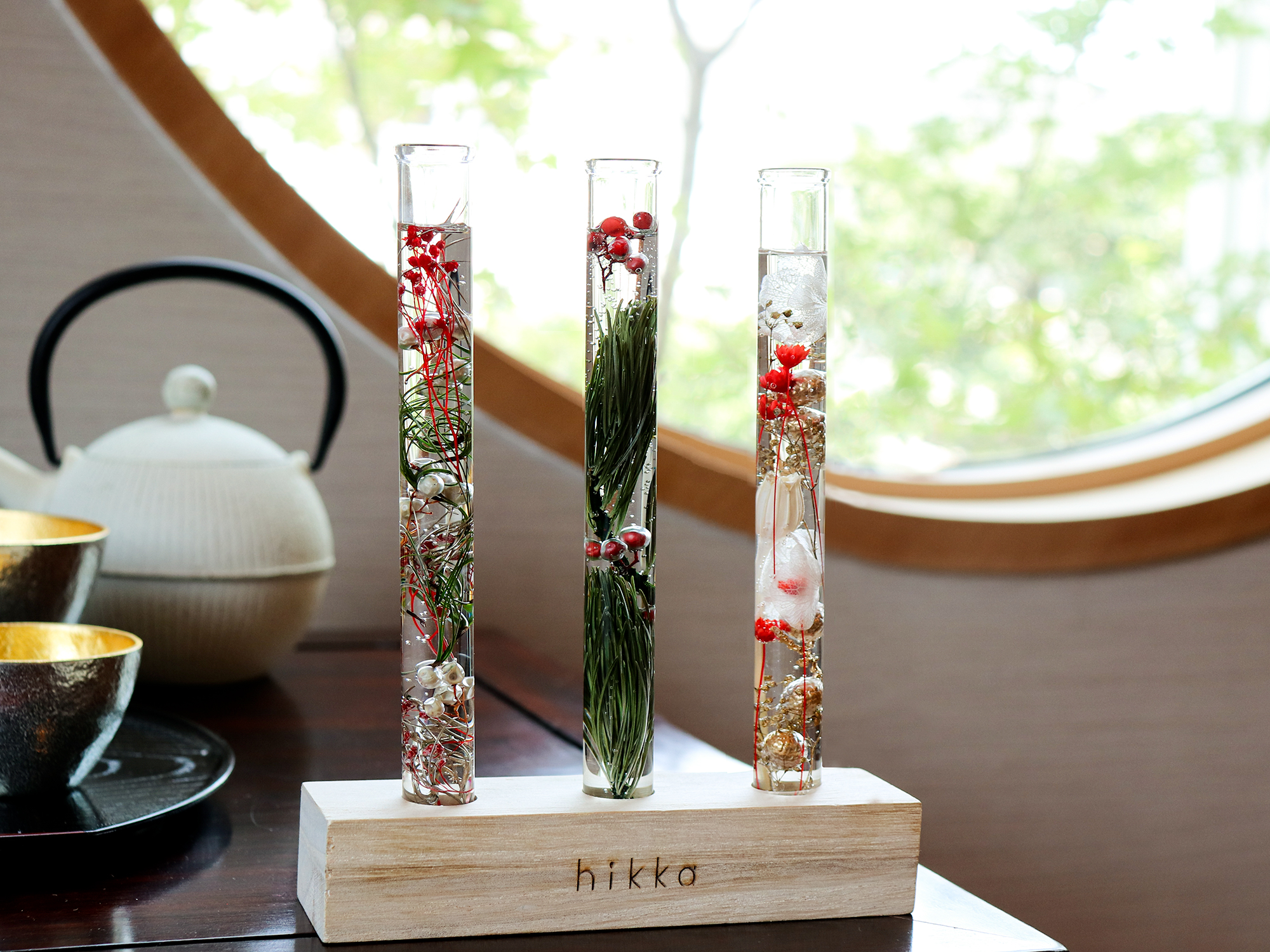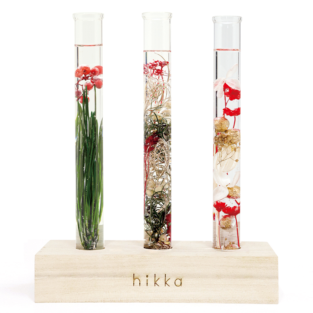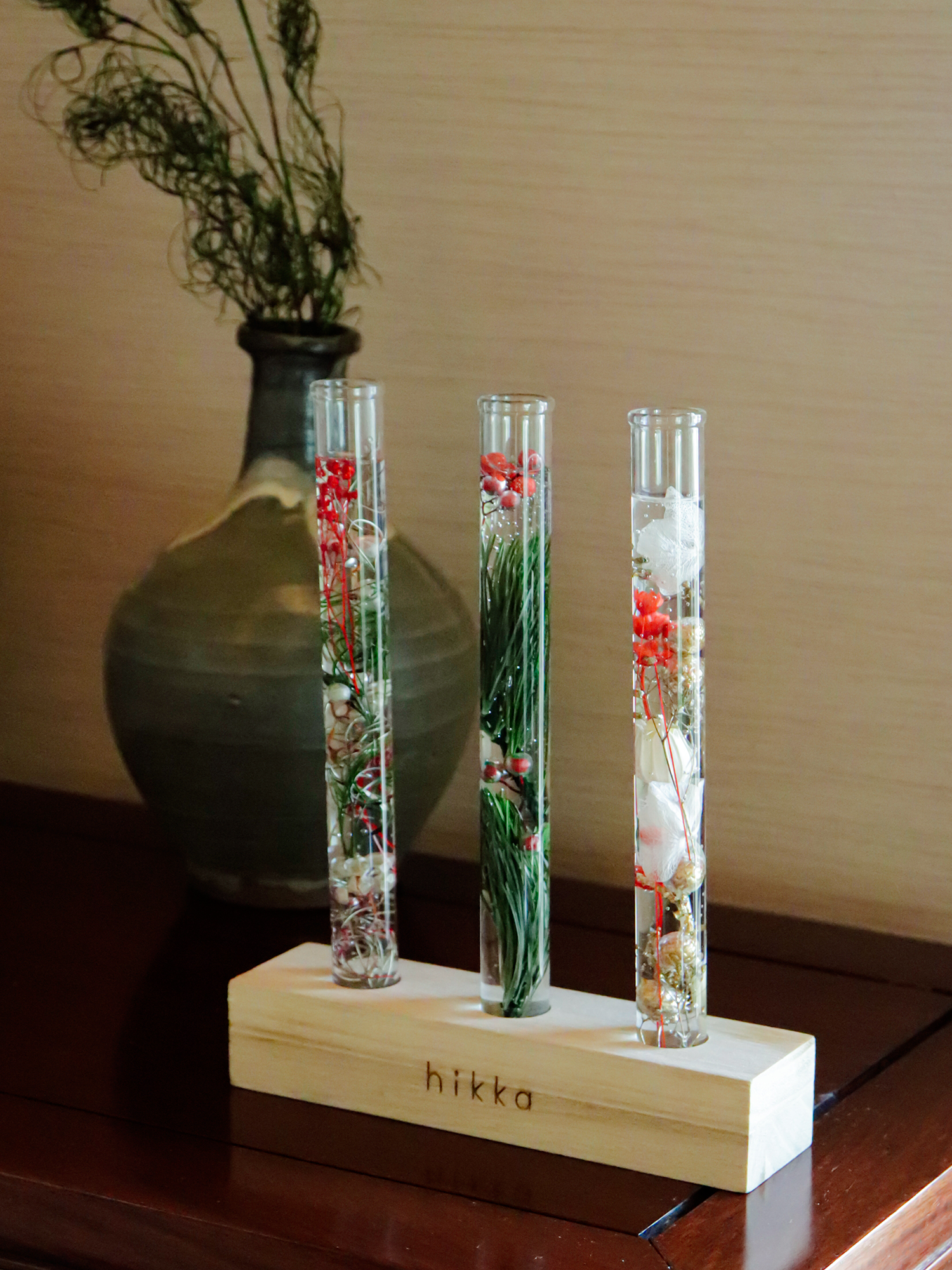 「花を味方に」をブランドメッセージに誕生した、舞い上がる花びらのようにひとりひとりの飛躍を願うお花のプロダクトブランド「hikka(ヒッカ)」。本物の草花を、ハーバリウムの世界観をそのままに試験管に閉じ込めました。お正月デザインがセットになった商品です。