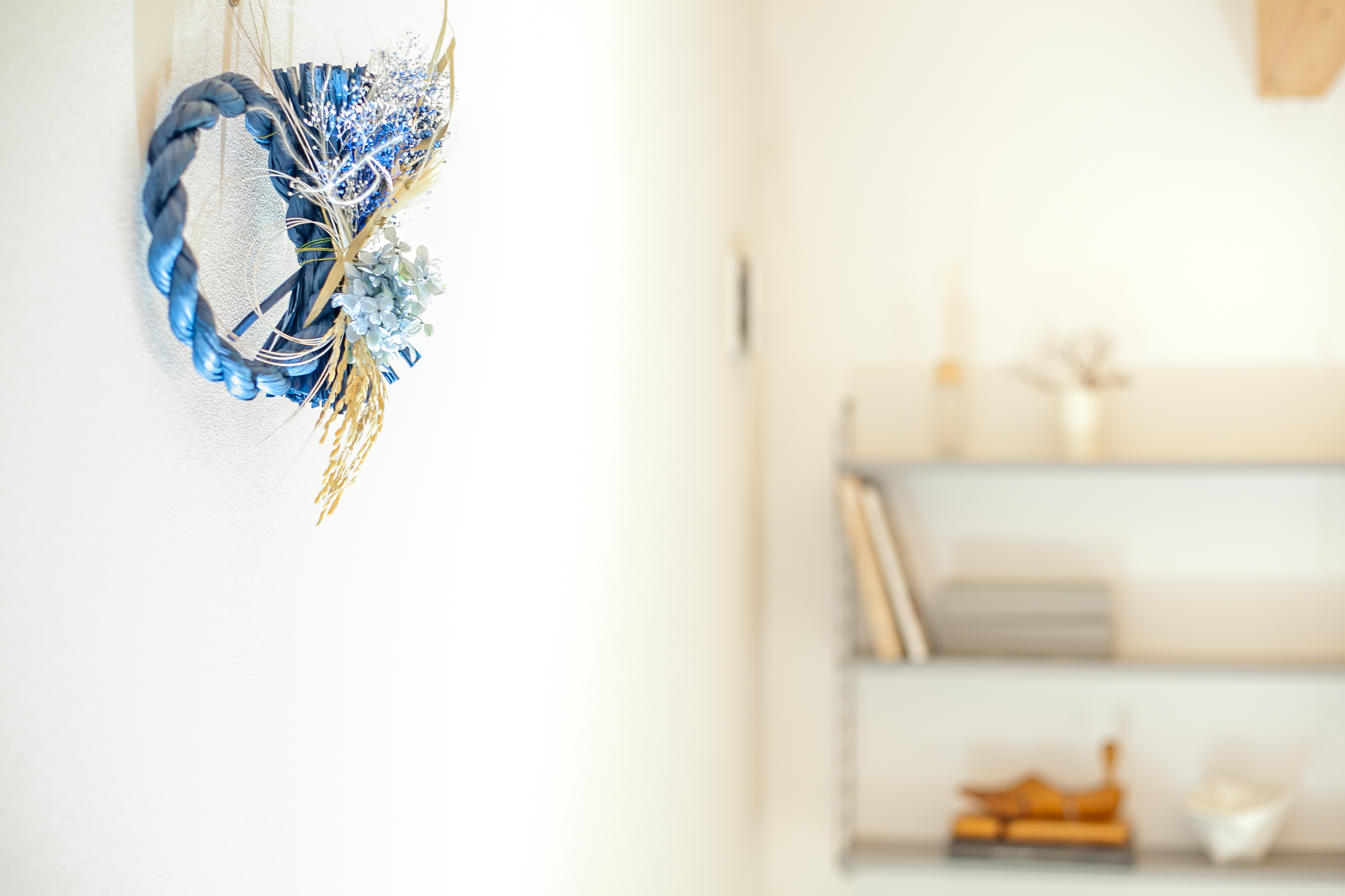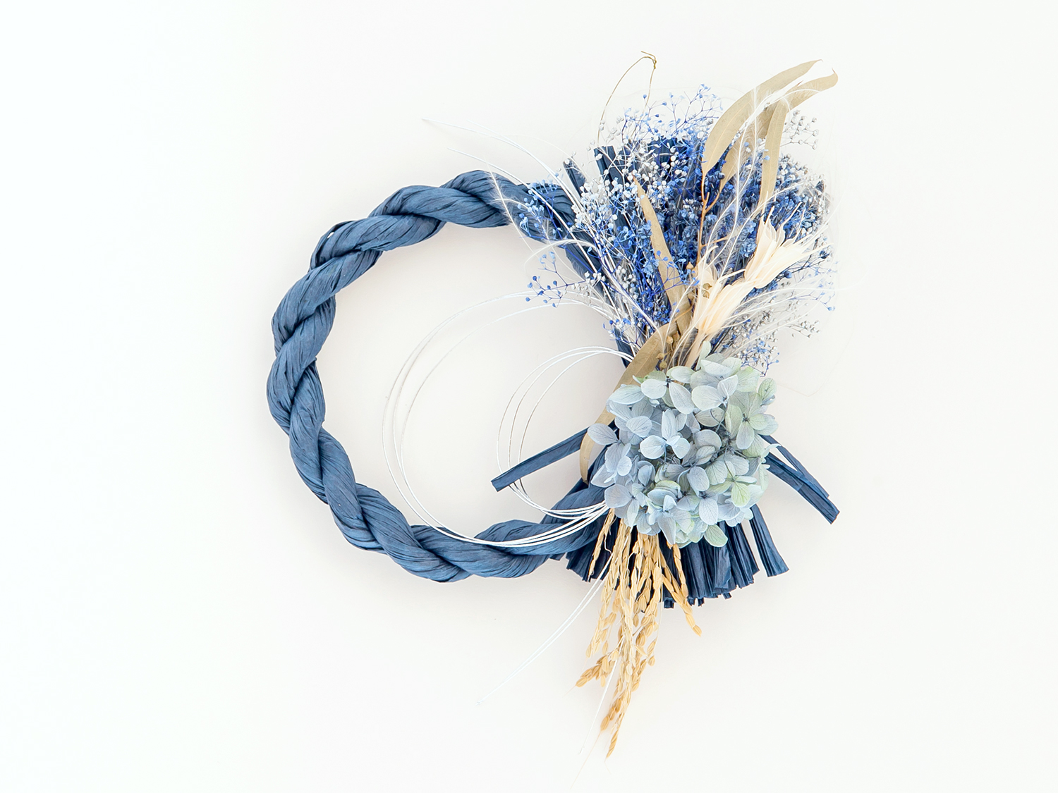 ネイビーのしめ縄に、ペールブルーのお正月飾りをあしらった、稀有なデザイン。お正月らしさを主張しすぎない、どんなお部屋にもなじむお色味です。シルバーの水引と垂れ下がる稲穂がポイント。ユーカリ、カスミソウをベースに、ブルーとグリーンのグラデーションが目を引くアジサイをあしらって。