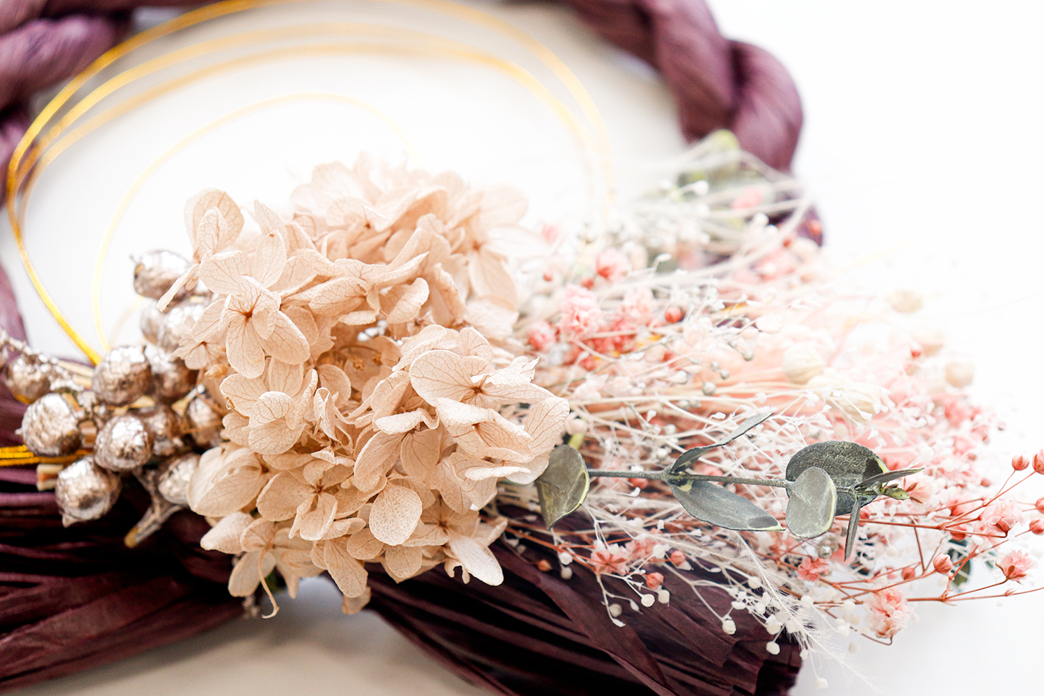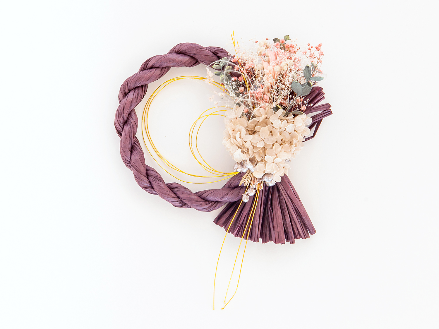 ワインレッドのしめ縄に、落ち着いた色合いのピンクのお花飾りを。シックな色合いでインテリアにも馴染みが良く、玄関やお部屋を華やかに。ユーカリ、カスミソウをベースに、シャンパンピンクのアジサイをあしらってボリューム感もたっぷり。お正月らしいプラチナピンクのカネラの実とゴールドの水引の相性抜群です。