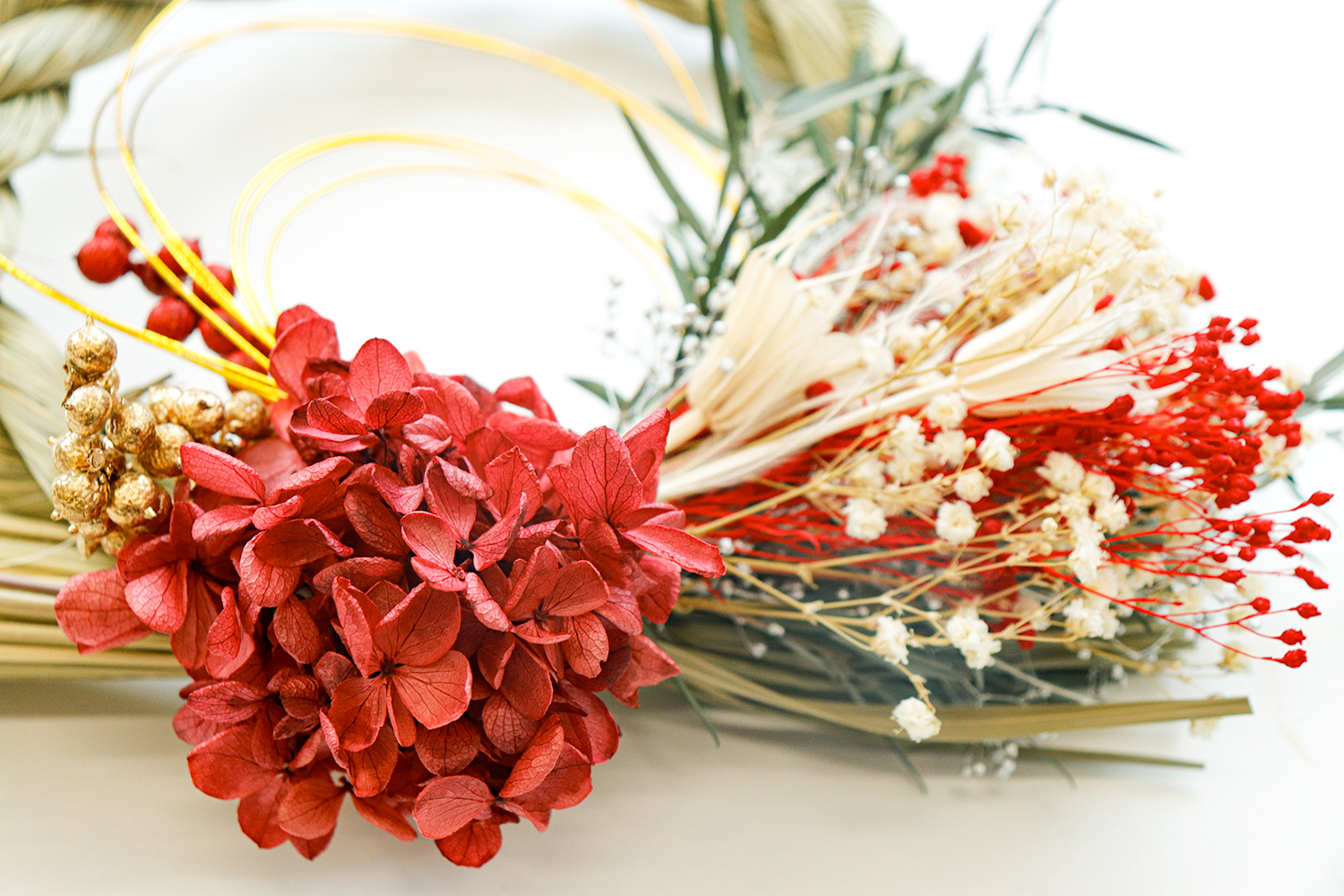 プレーンなしめ縄にレッドのお花飾りをあしらった、ベーシックな色合い。レモングラスの葉とカスミソウをベースに、落ち着きのあるワインレッドのアジサイをあしらった、スタンダードでシックなデザイン。「RED×GOLD」という組み合わせはまさにお正月の定番です。
