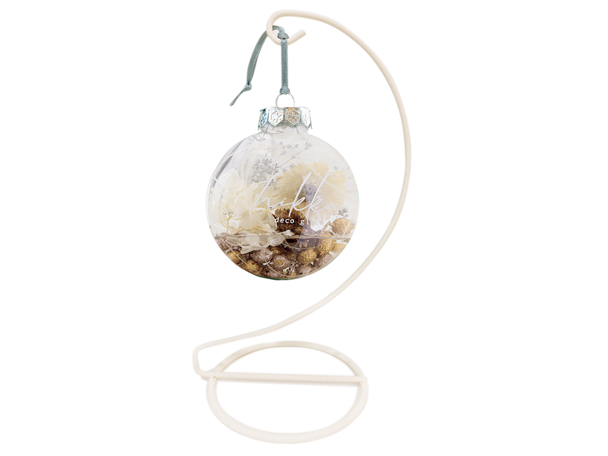大口注文・法人のお問い合わせはこちら美しさが長く続くドライフラワーとプリザーブドフラワーをぎゅっと詰め込んでオーナメントにしました。本物の花々がまるで水中で浮遊しているような、新感覚のインテリア。こちらはスタンド付商品になります。付属のスタンドに掛けてお楽しみいただけます。