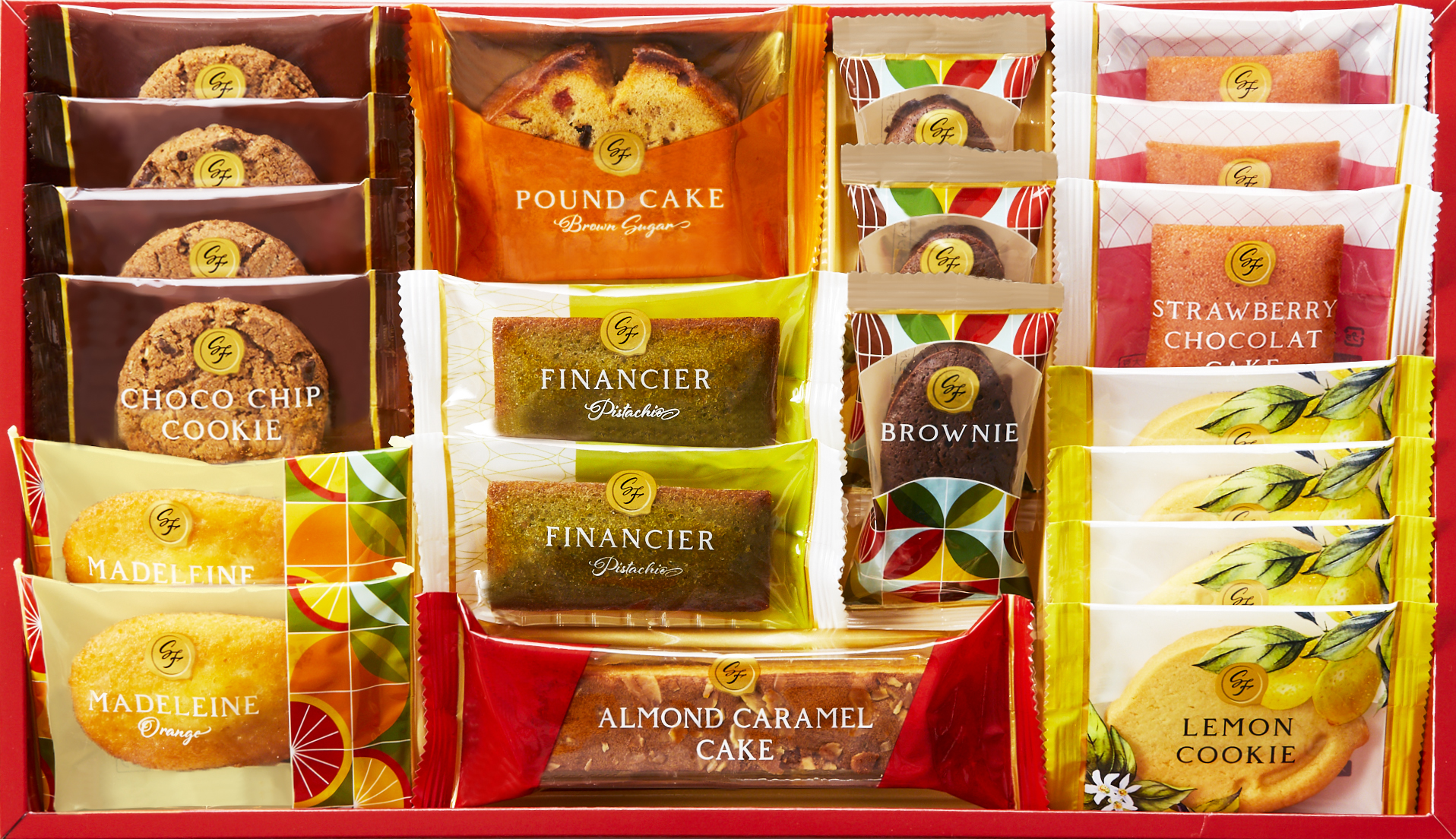大口注文・法人のお問い合わせはこちら贅沢なひと時を華やかに彩る伝統の焼き菓子です。素材と製法にこだわり焼き上げ、愛され続ける8種の焼き菓子(ストロベリーショコラケーキ、ブラウニー、オレンジマドレーヌ、ピスタチオフィナンシェ、ブラウンシュガーパウンドケーキ、アーモンドキャラメルケーキ、レモンクッキー、チョコチップクッキー)をお愉しみください。