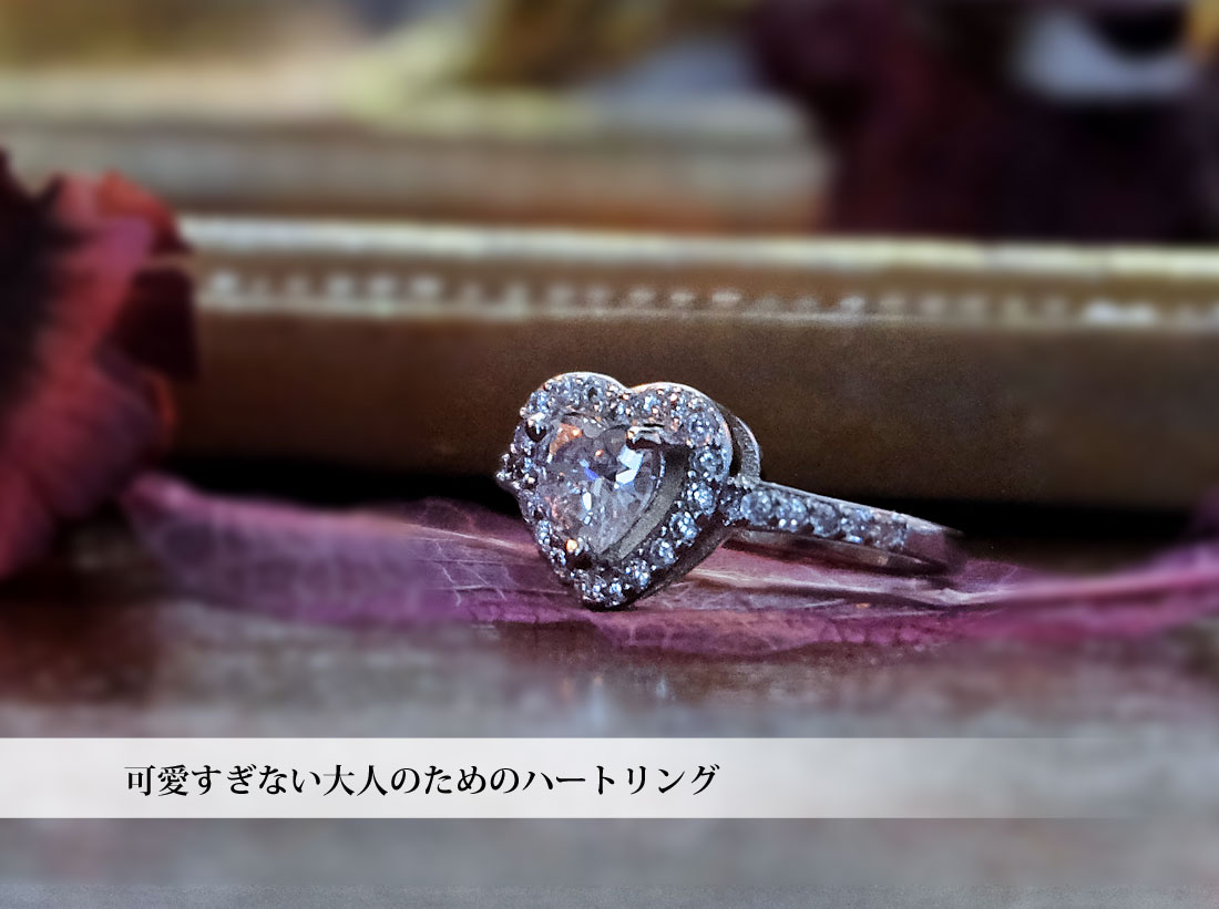 大口注文・法人のお問い合わせはこちら6ミリのハートシェイプカットのセンターストーンを30粒近いメレストーンで包んだ華やかなデザインのハーフエタニティリング。大人の女性のために作った、甘さを抑えたエレガントなハートモチーフリングです。