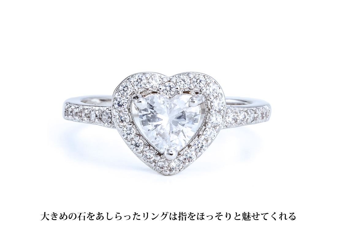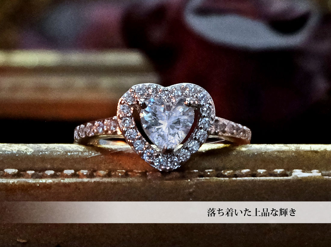 | 原材料 | ・ストーン CZ ダイヤモンド カット:ハートシェイプカット/約6×6mm 個数:1 カット:ラウンドカット/約1.0mm 個数:29(約0.145ct) CZダイヤ(キュービックジルコニア)は人工石です。当店では最高級AAAAAランクのCZダイヤを使用しています。 |
