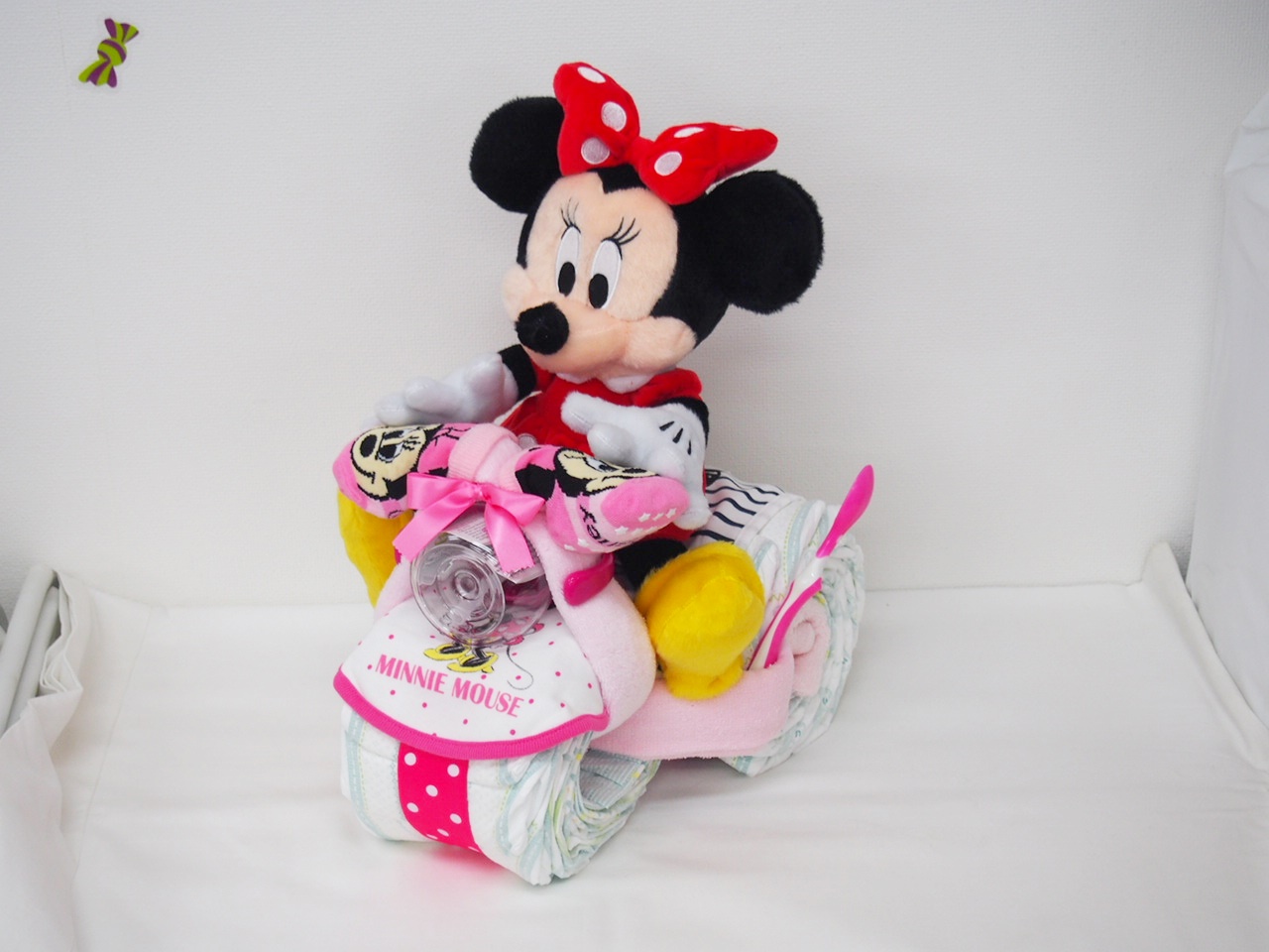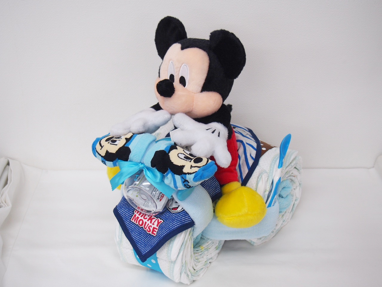 ・パンパースおむつ ・ぬいぐるみ(ミニー、ミッキー) ・ディズニースタイ ・ディズニーソックス ・フェイスタオル×2 ・ウォッシュタオル×3 ・マグ ・離乳食スプーン ・サテンリボン ・ケーキトレー